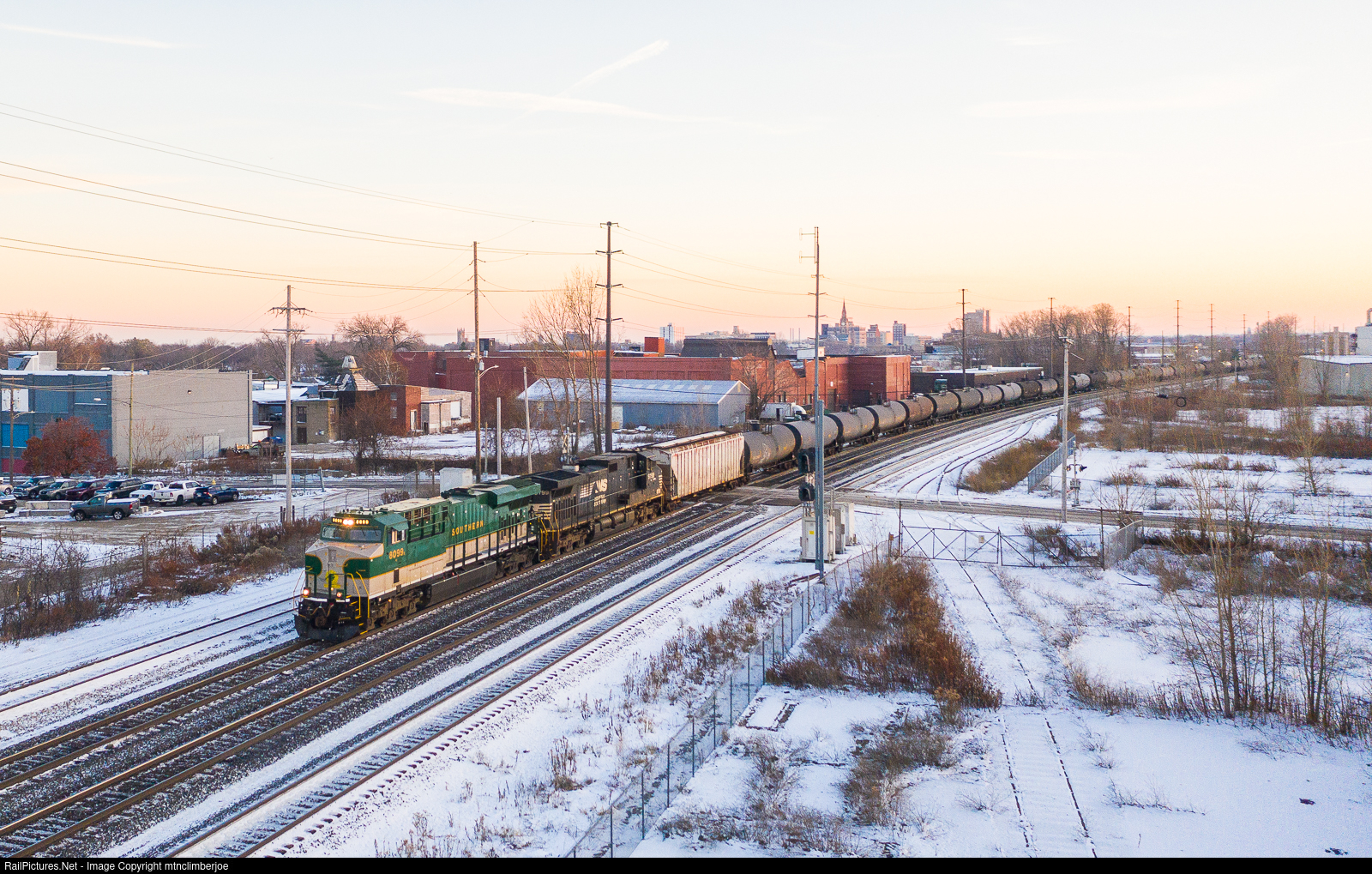 It's just a few minutes before sunrise in Erie, Pennsylvania as the Southern Railway heritage unit cruises across Cascade Street and heads west. While the NS mainline is parallel to the tracks here, this is CSX train B742 on the CSX Erie West Subdivision bringing ethanol empties from Oak Island, New Jersey for interchange with Union Pacific in Proviso, Illinois.