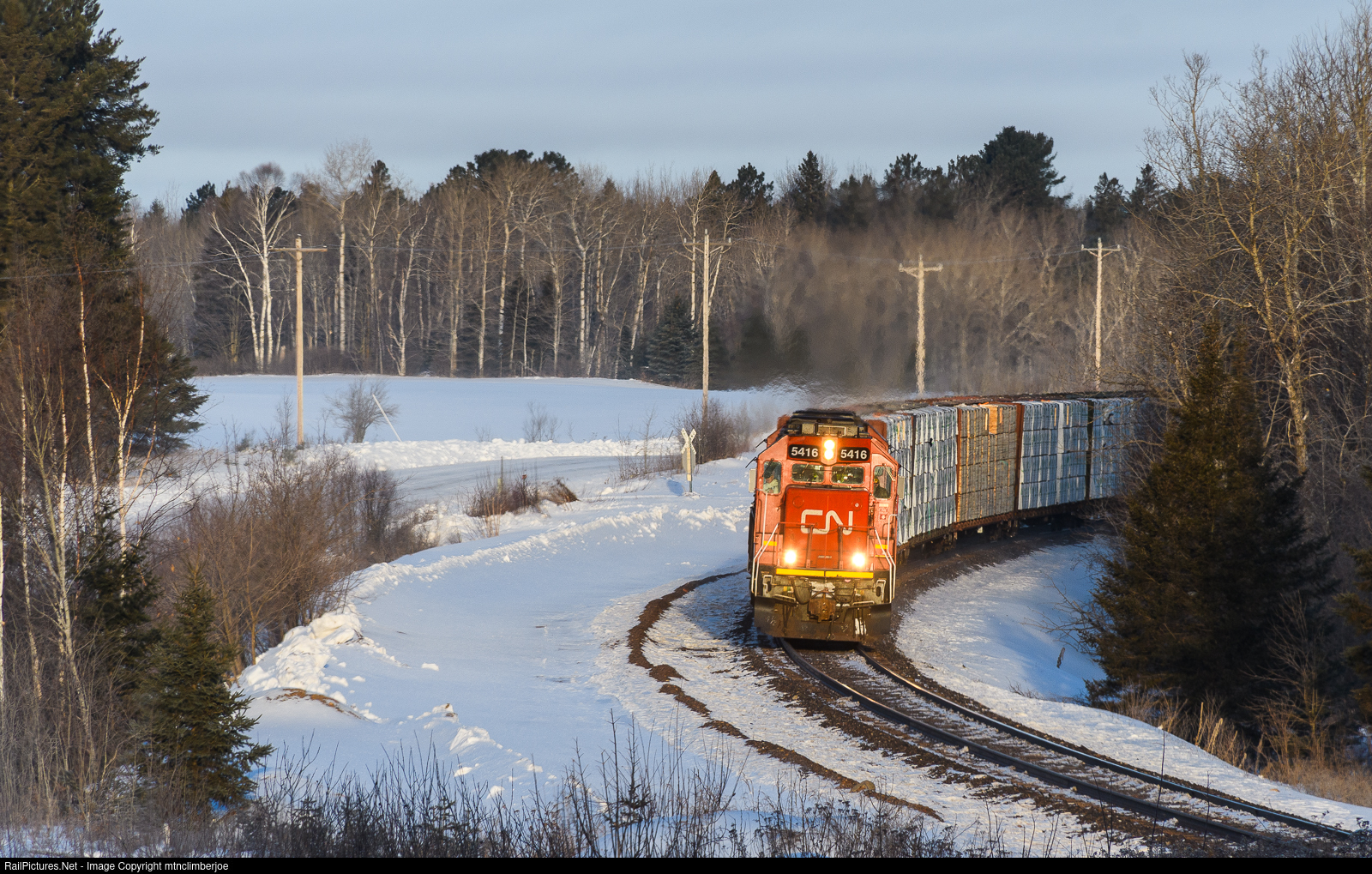 | As the sun rises in Grand Lake, Minnesota, a pair of SD60's cruise around the bend at Bear Trap Road as they head south on the Missabe Subdivision. This is Canadian National's L568 that brings freight from Rainer down to Proctor Yard outside of Duluth. |