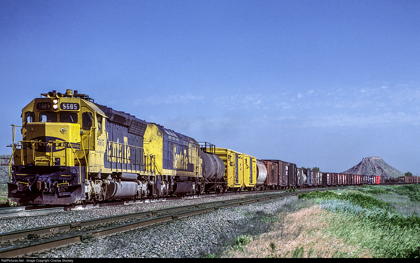 HEMAN OK June 18 1979 — Santa Fe SD45 5605 heads west with train 138. EMD built the unit (s/n 35010) in May-June 1969, delivered it as an RCE Locotrol lead unit and painted in Bookends livery consisting of blue body and yellow ends. Sometime after August 26 1972 it was repainted in blue body with yellow warbonnet. In September 1985 the San Bernardino CA shops rebuilt the unit as an SD45u. As part of the proposed Southern Pacific, Santa Fe merger the shops painted it into SPSF livery with red body, yellow warbonnet, black roof and black frame. It was renumbered SPSF 5401. It was the second Santa Fe unit to be painted in the merger livery. It was essentially the same livery as that which was on the first SPSF repaint, ATSF 5394, but with yellow lettering instead of white. Within a matter of weeks, the paint job was modified to reflect the final version of the SPSF scheme with three stripes in the noseband instead of four and a higher level of the black roof line extending just to the bottom of the dynamic brake blister. In a July 1986 decision the Interstate Commerce Commission denied the merger. Before Jan 1 1991 the unit regained its yellow warbonnet livery and was renumbered ATSF 5401. Santa Fe retired the unit in April 1995. On Sept 22 1995 it was transferred to Burlington Northern Santa Fe in yellow warbonnet livery and renumbered to BNSF 6412 with 15-inch BNSF lettering on the cab sides. It was retired in April 1995 and acquired by National Railway Equipment Co. and renumbered NREX 6412. My photo.
