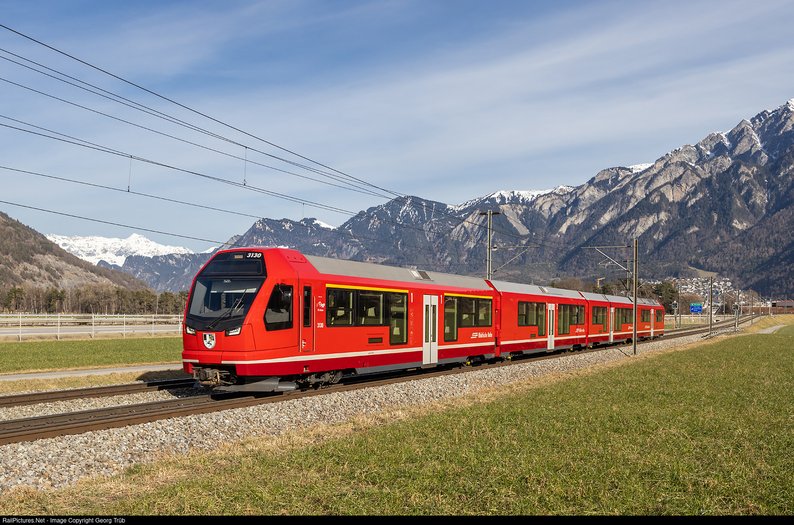 | "Capricorn" ABe 4/16 # 3130 of the Rhaetian Railway, new with the name and symbol of the Piz Badus mountain (near the Oberalp pass), is running the S2 service 1517 from Schiers via Landquart-Chur to Rhäzüns, between Chur and Felsberg. |