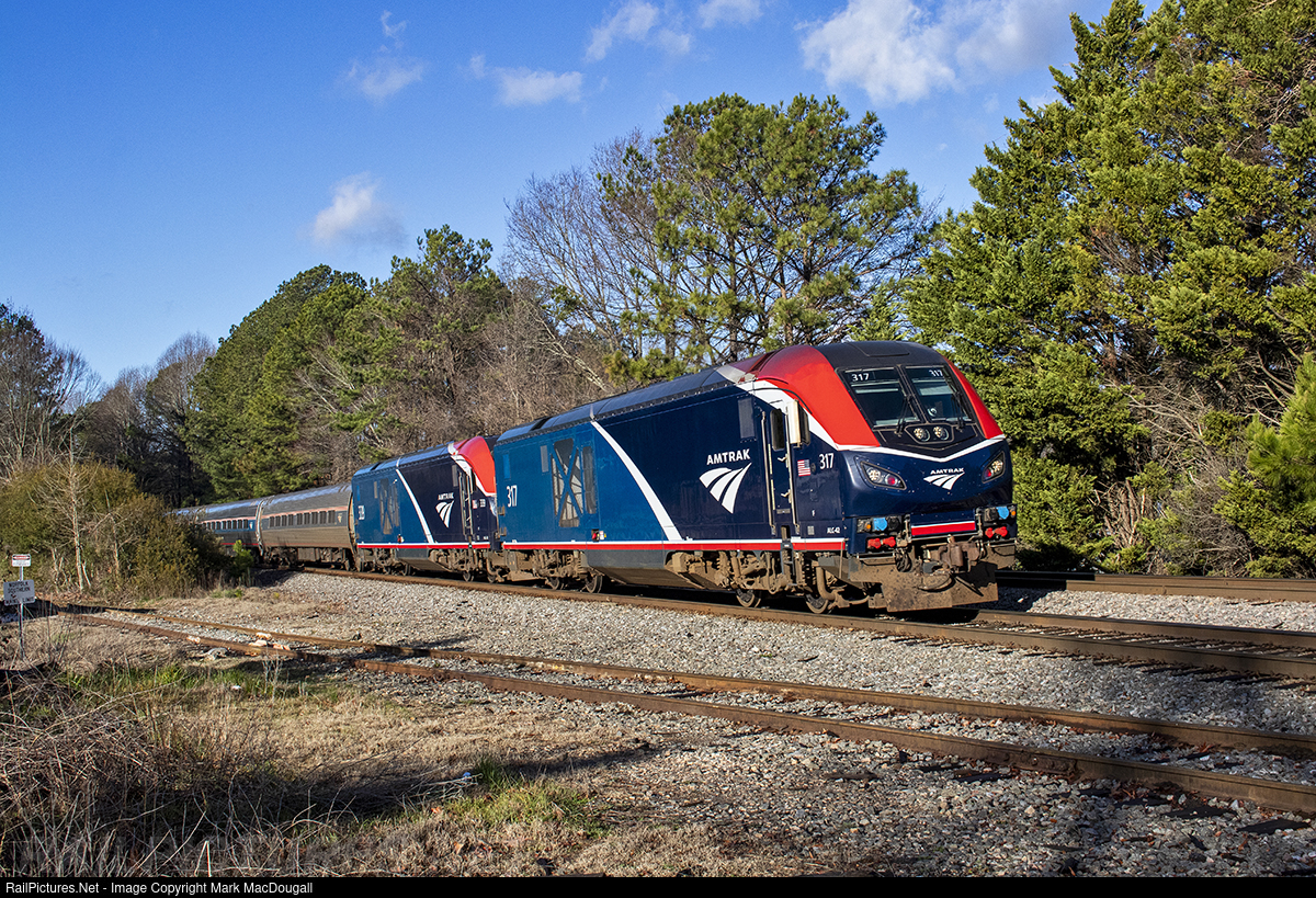 | For the first time, a pair of Chargers lead northbound Silver Silver 92 in Cary. Amtrak has been running P42-ALC42 sets on the Silver Star for a few months, but started running them as leaders once more crews were qualified on them. This pair ran south a couple nights prior on counterpart 91, but this was the first opportunity to see a matched pair in daylight in the Triangle region. |