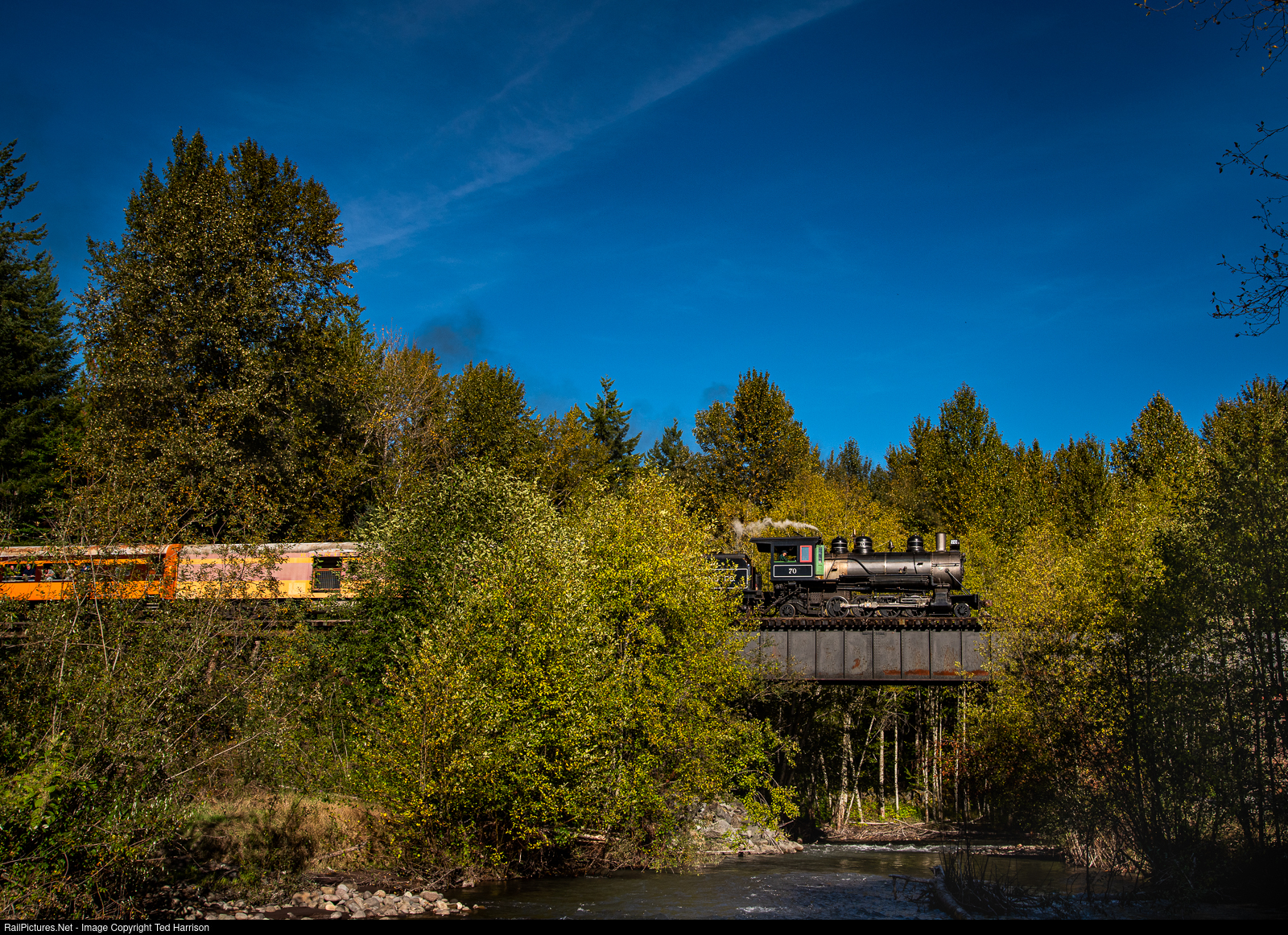 Polson Logging #70 pulls it's train over the bridge over the Nisqually River on the former Milwaukee Road branch line heading towards Mineral.