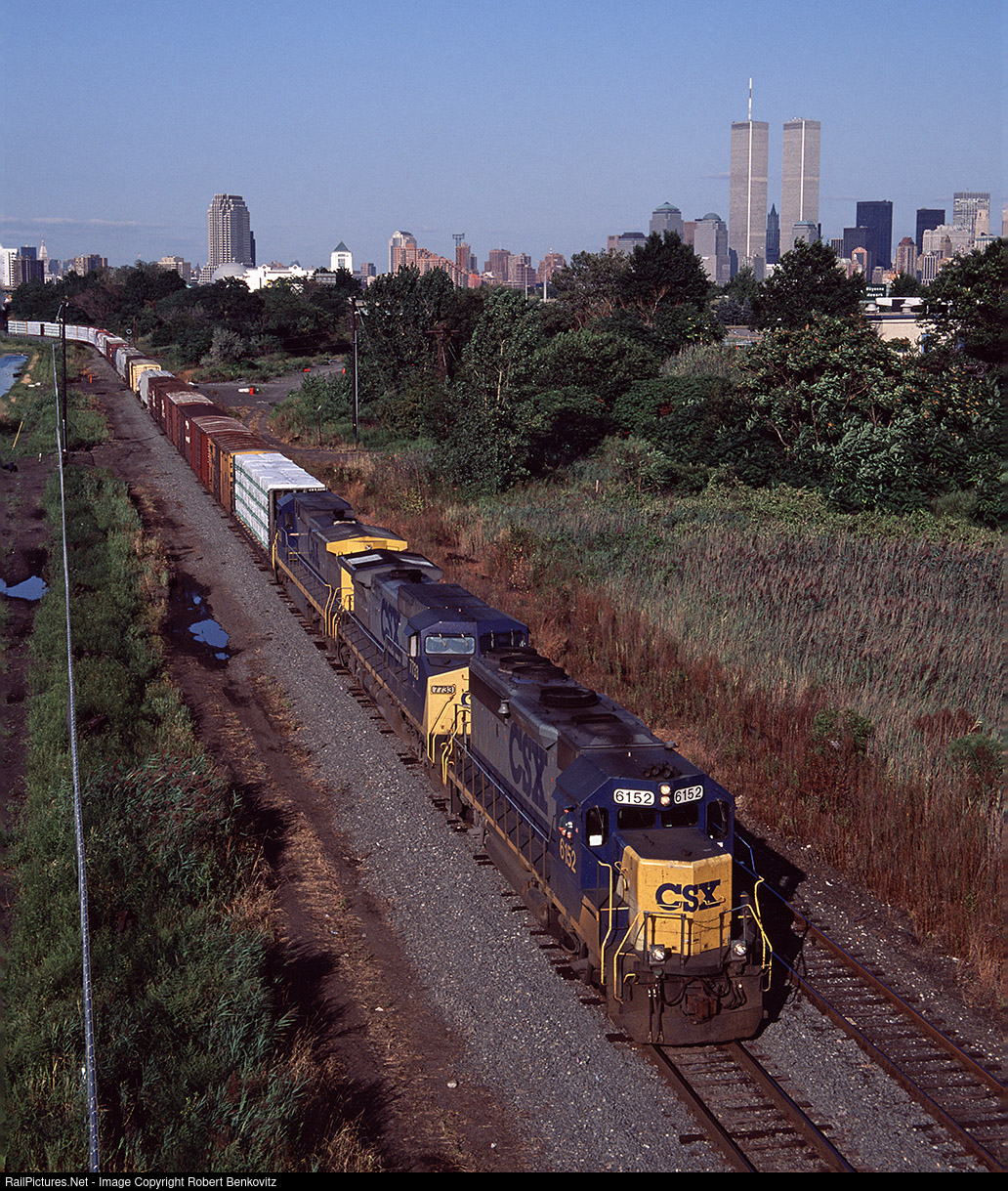 A pure CSX consist leads a southbound merchandise train on Conrail's National Docks line in Jersey City, NJ. Lower Manhattan skyscrapers, including (of course) the original World Trade Center, look resplendent in the late summer sun