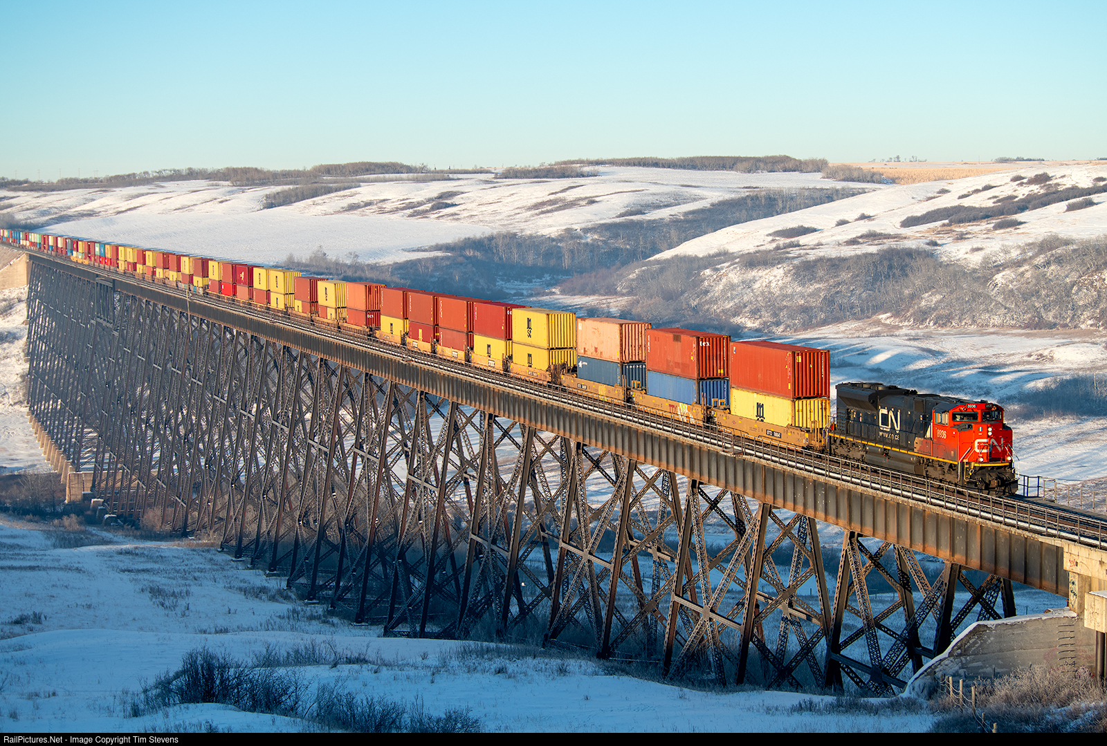Prince Rupert-Chicago train Q198 soars across the Battle River Trestle on CN's Wainwright Sub.