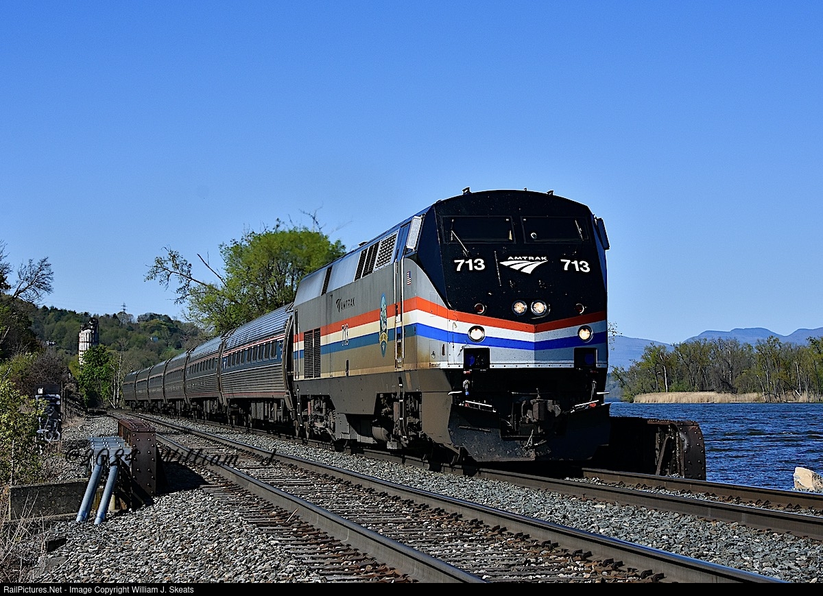 | Amtrak Maple Leaf Train 63 heading north over the Hudson River Rail Bridge that spills into North Bay in Hudson, NY P32AC-DM 713 and six Amfleets. No Entry to Canada. Only going as far as Niagara Falls. |