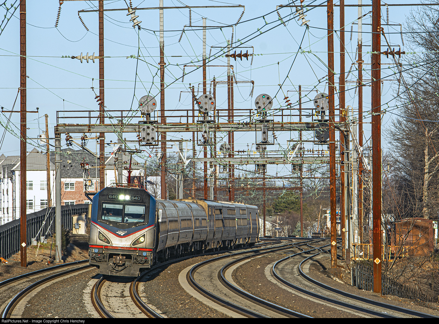 | Already running a few minutes late out of Penn Station, Amtrak's Silver Meteor leans into the super-elevated curve at Metropark. The train has many miles and hours before it reaches its destination, tomorrow in Miami. |