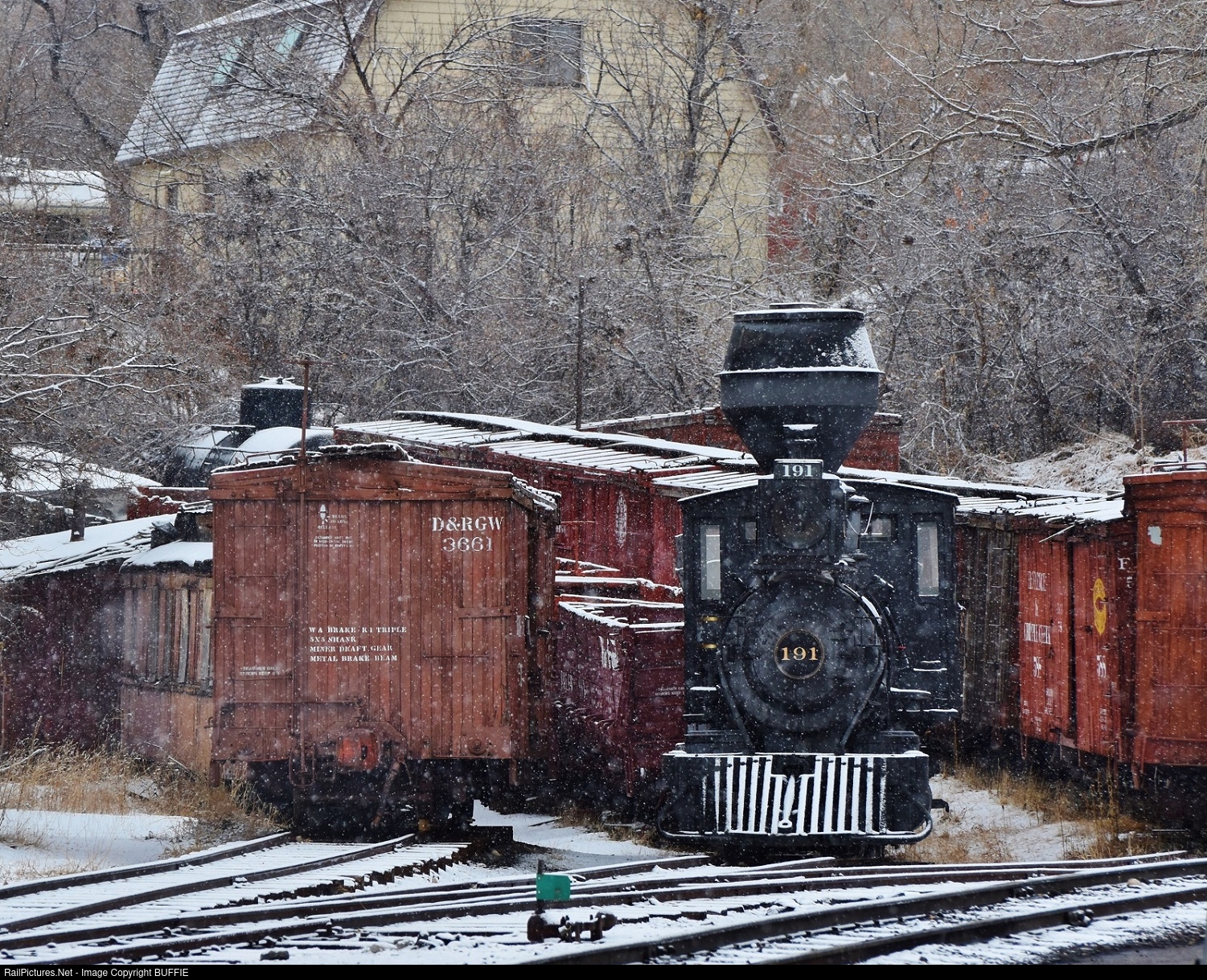 Heavy snow falls on the Colorado Railroad Museum's Denver Leadville & Gunnison's #191 (2-8-0).