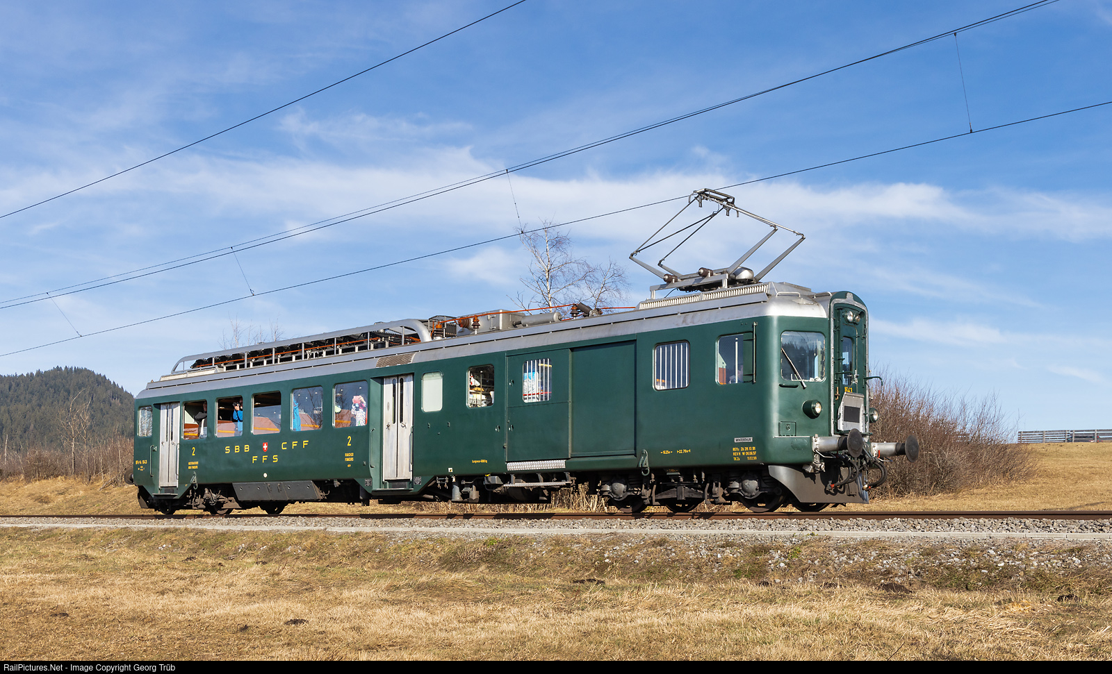| Electric railcar with passenger and baggage compartment BDe 4/4 # 1643 "Wyländerli" of SBB Historic is on a Sutter Bahnreisen special from Winterthur via Bauma-Rapperswil-Pfäffikon SZ-Arth Goldau-Zug-Sihlwald-Zürich to Winterthur, between Biberbrugg and Altmatt on the line of the Südostbahn (SOB). The railcar was built in 1955 by SLM, BBC, MFO and SAAS for the SBB mainly for branchline services as CFe 4/4 # 863. |