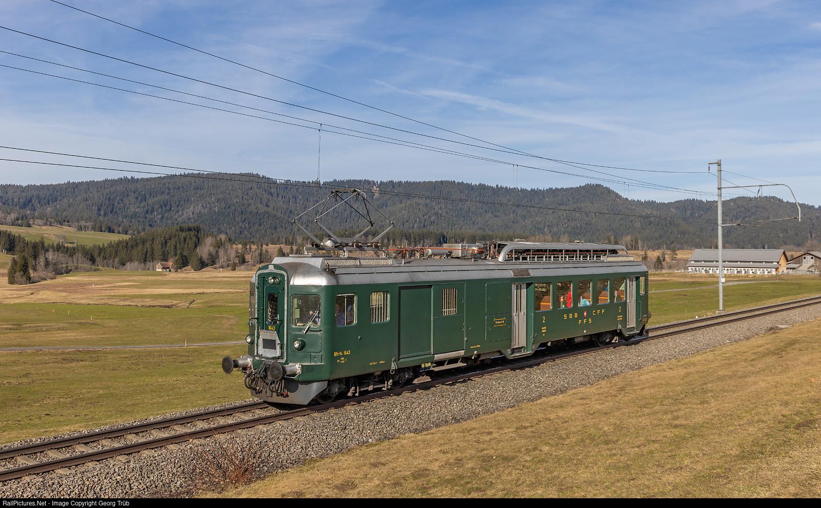 | Electric railcar with passenger and baggage compartment BDe 4/4 # 1643 "Wyländerli" of SBB Historic is on a Sutter Bahnreisen special from Winterthur via Bauma-Rapperswil-Pfäffikon SZ-Arth Goldau-Zug-Sihlwald-Zürich to Winterthur, between Altmatt and Rothenthurm on the line of the Südostbahn (SOB). The railcar was built in 1955 by SLM, BBC, MFO and SAAS for the SBB mainly for branchline services as CFe 4/4 # 863. Declared historic vehicle in 1996. |