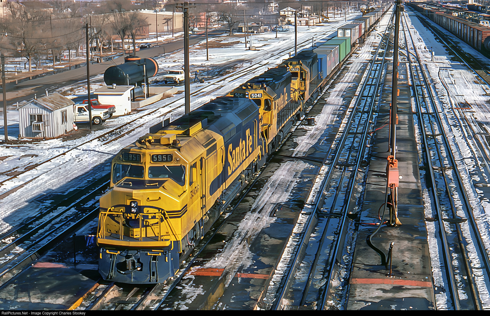| CLOVIS NM Jan 22 1984 — A light snow sets the scene as ATSF SDF45 5956, SD40-2 5041 and SD45-2 5633 sit at the west fuel racks. EMD built the unit (s/n 34042) in December 1967 as ATSF 1906 and delivered it in Bookends livery with blue body and yellow ends. In the general renumbering it became ATSF 5906 in March-July 1970 and was repainted in blue body with yellow warbonnet livery and chrome yellow Santa Fe lettering on the long hood. The San Bernardino CA shops rebuilt it to an SDF45 and renumbered it to ATSF 5956 in May 1982.It was rebuilt with a flat pilot in February 1995. Santa Fe retired the unit in May 1995. It was acquired by Wisconsin Central on June 16 1995 and renumbered WC 6651. A photo taken on June 12 2001 by Les Pitcher posted on Diesel Locomotive Lovers Facebook page shows the unit in Wisconsin Central livery. My photo.