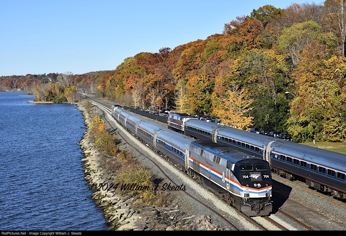 The meet of the two Ethan Allen Express Trains at Rhinecliff. To the left is Train 290 from Burlington, Vermont to Penn Station. P32AC-DM 704, five Amfleets, and P32AC-DM 709. To the right is Train 291 from Penn Station to Burlington, Vermont leaving Rhinecliff with P32AC-DM 707 and five Amfleets. No wye in Burlington, service extended July, 29, 2022, so engines on both ends are required.