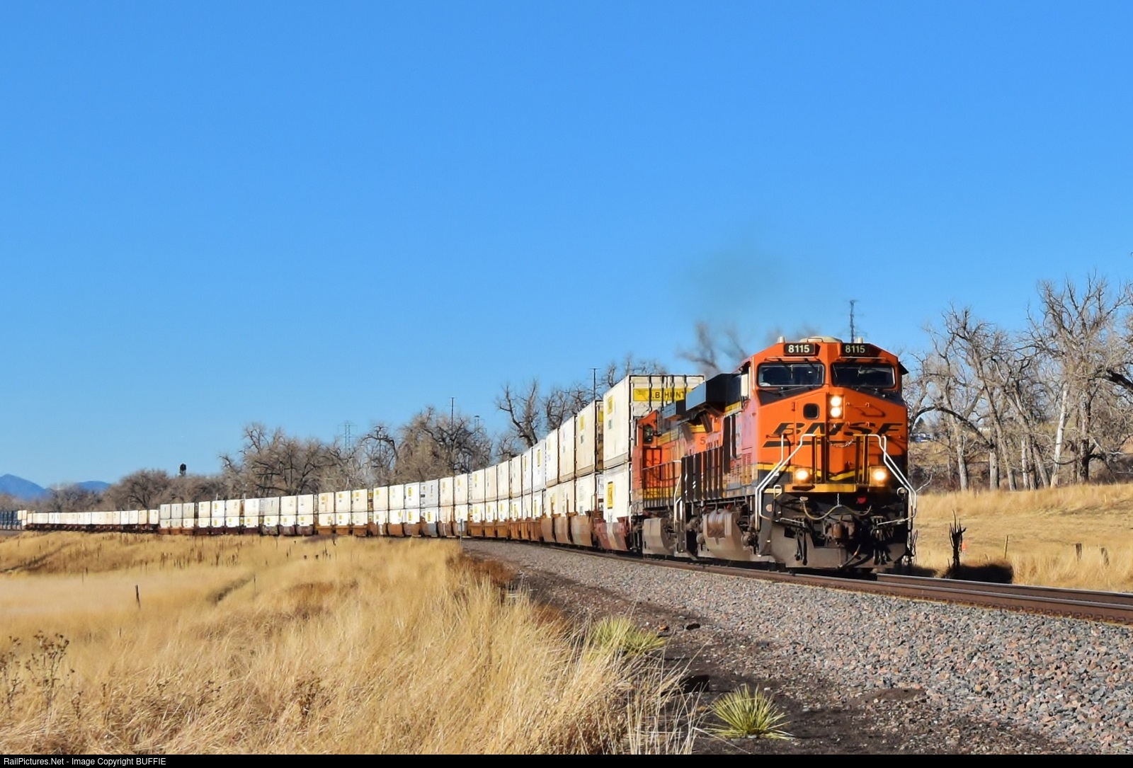 BNSF 8115 (ES44C4) leads a JB Hunt stack train towards Acequia, Colorado as it runs south on the Joint Line.