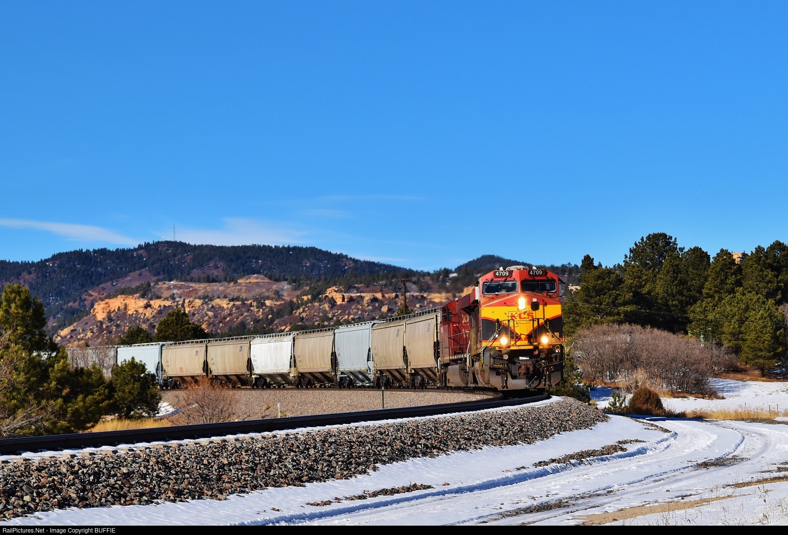 KCS 4709 (ES44AC) leads a grain train south on the Joint Line through Monument, Colorado.
