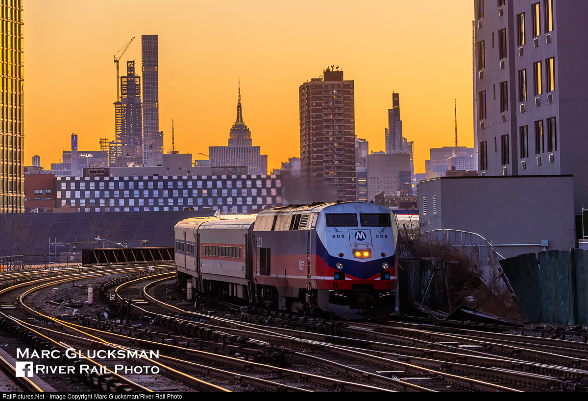 Sunset Beachball. MTA Metro-North Railroad (MNCW) 208 (Beachball/40th Ann) led train 849 through the Bronx, New York at the hour of sunset on Tuesday, February 6, 2024. This was the first heritage wrap released by Metro-North, and it honors the first paint scheme that the railroad used on its locomotives. The constantly evolving skyline of Manhattan is visible in the background with the lighted sign of the MetLife building peeking through and the Empire State Building rising above the center.