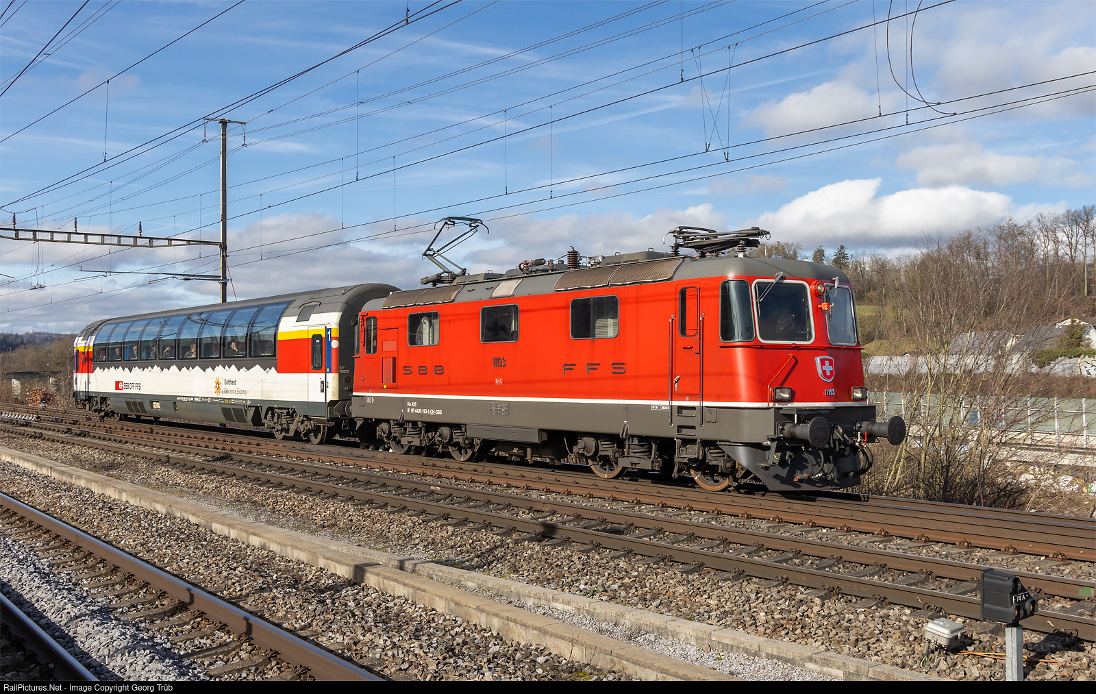 | Re 420 # 193 (Re 4/4 II # 11193) of the SBB pulls the Bahnreisen Sutter special 31555 with an Apm panorama car from Zürich main station via Zürich Oerlikon-Regensdorf-Würenlos to the Limmattal shunting yard (RBL) Tivoli stop, through Killwangen-Spreitenbach. |