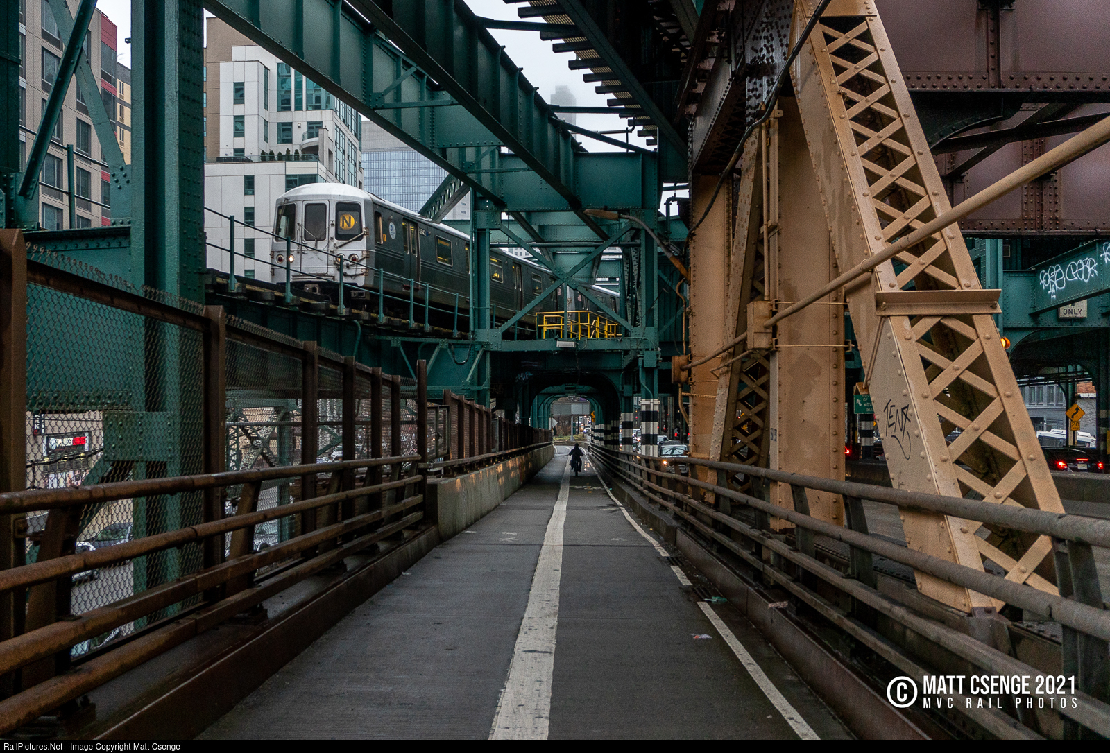 A Manhattan-bound (N) train is seen through the steel structure of the Astoria Line and Queensboro Bridge as it departs Queensboro Plaza station. The empty trackways above once brought BMT trains to the now-demolished half of the aforementioned station, which was once twice its current size. Additionally, the area where I am standing, which now carries bicycles and pedestrians over the bridge, was originally a streetcar lane for trolleys to Manhattan!