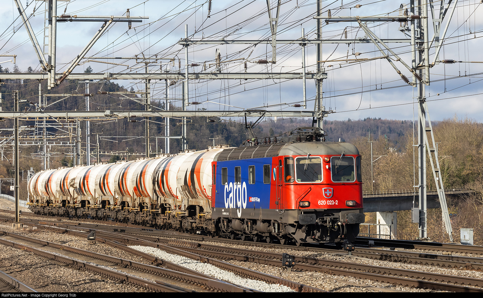 | Re 620 # 023 (Re 6/6 # 11623) "Rupperswil" of the SBB pulls the HOLCIM train 47041 from Singen am Hohentwiel/Germany via Schaffhausen-Bülach-Regensdorf-Zürich Altstetten-Thalwil-Ziegelbrücke-Sargans to Zizers through Killwangen-Spreitenbach. The train is transporting slag sand in Uacns silo cars to the Zizers ciment works and came over the limmat bridge from Würenlos, visible on the right in the background. |