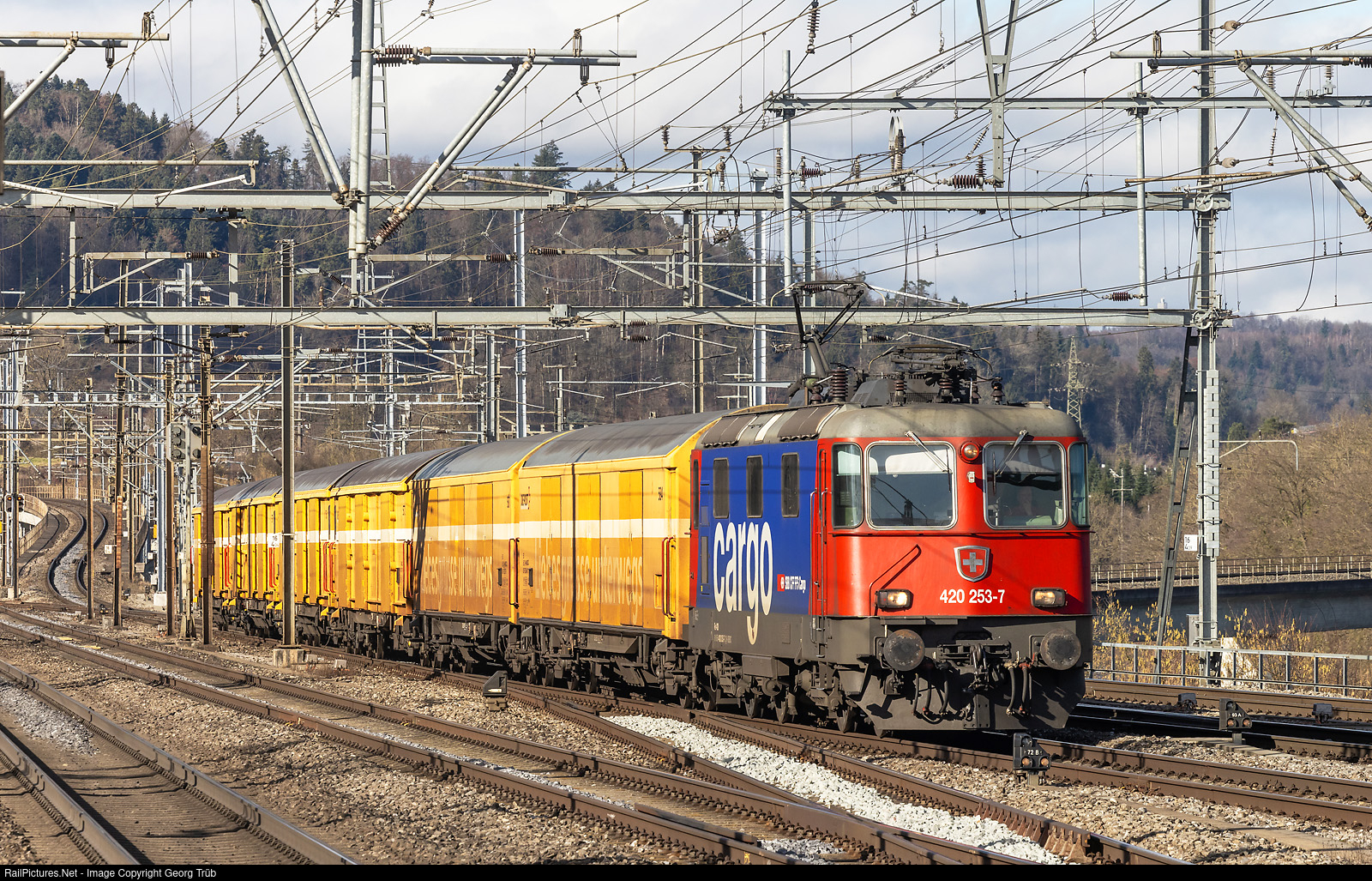 | Re 420 # 253 (Re 4/4 II # 11253) of the SBB pulls the fast letter mail train 50015 from Daillens via Yverdon-les-Bains-Neuchâtel-Biel-Härkingen sort center-Olten-Lenzburg-Zürich Müllligen sort center-Kloten-Winterthur to Gossau SG, through Killwangen-Spreitenbach. This train with 4 axles cars circulate with up to 140 km/h between Daillens and Zürich Mülligen, then further with up to 120 km/h to Gossau. |