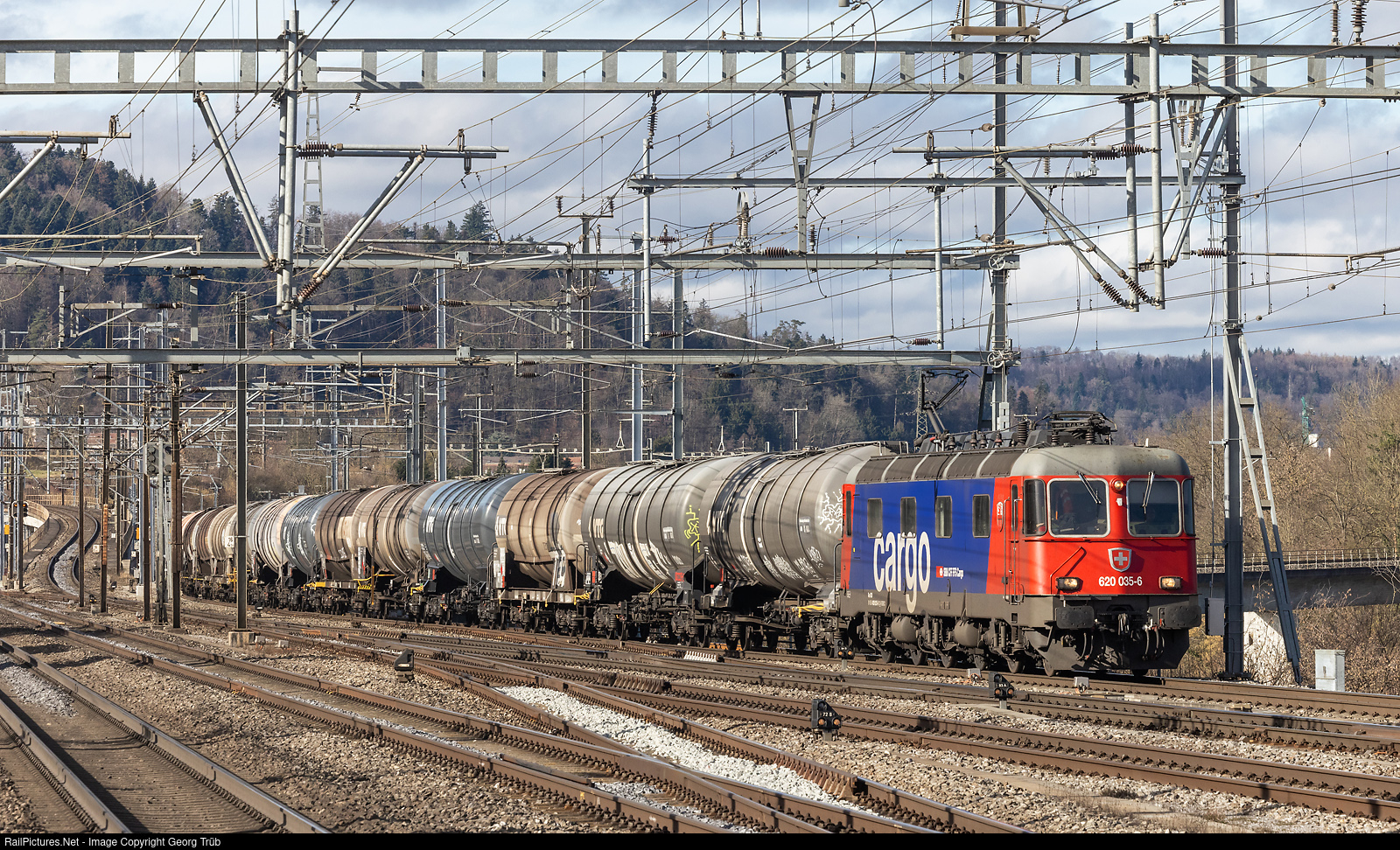 Re 620 # 035 (Re 6/6 # 11635) "Muttenz" pulls the loaded about 1800 ton tank car train 69549 from Cornaux via Biel-Olten-Brugg to the Limmattal shunthing yard departing yard (RBLA) through Killwangen-Spreitenbach.