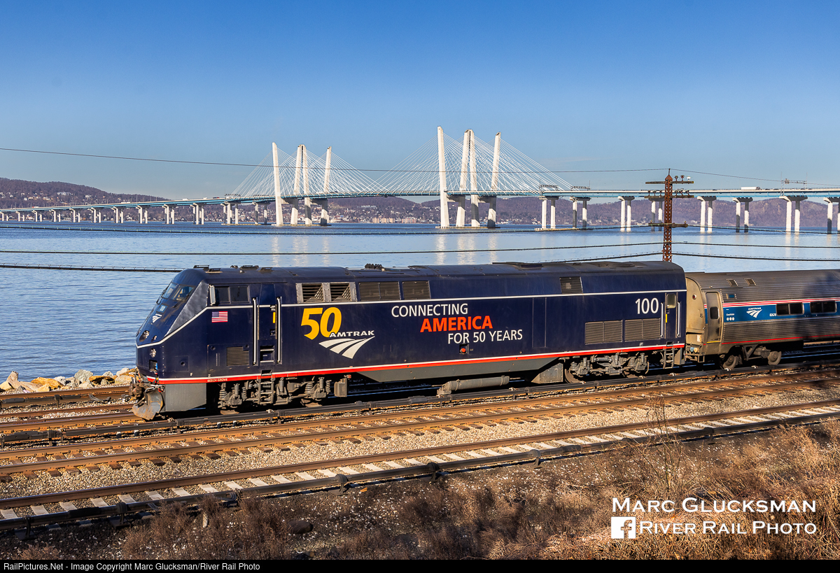 Midnight Blue And A Blue Sky. Amtrak 100 (P42DC, 50th Anniversary, Midnight Blue) is in a unique paint scheme that represents the "commitment of our employees moving people around the clock and across the nation. As occasionally happens, it has recently drawn the assignment running in place of a dual-mode locomotive in Empire Service on the Hudson Line. On Thursday, February 8, 2024, it is seen passing the Mario Cuomo Bridge (still known to locals as the Tappan Zee Bridge) in Tarrytown, New York, just about 20 miles away from its final destination at New York's Penn Station.