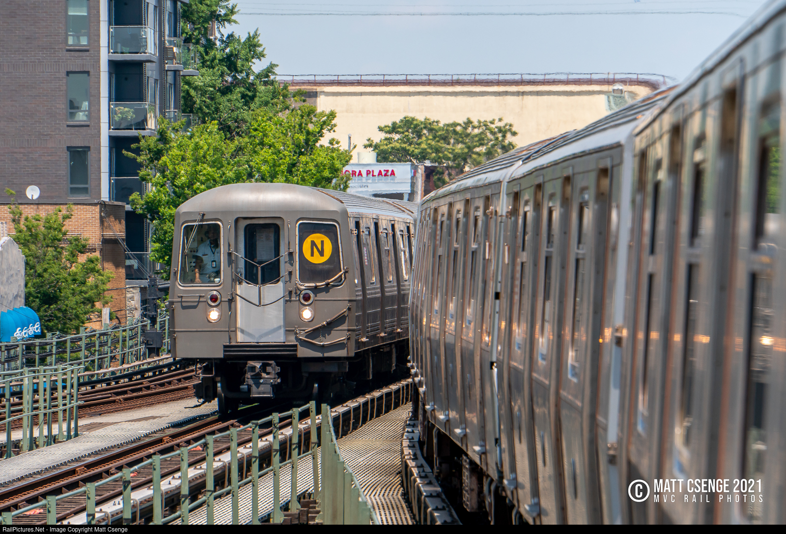 A Manhattan-bound New York City Transit Authority (NYCTA) N train is seen approaching Astoria Blvd Station on the Astoria Line, nearly blocked by the Astoria-bound train that decided to pull out and stop.