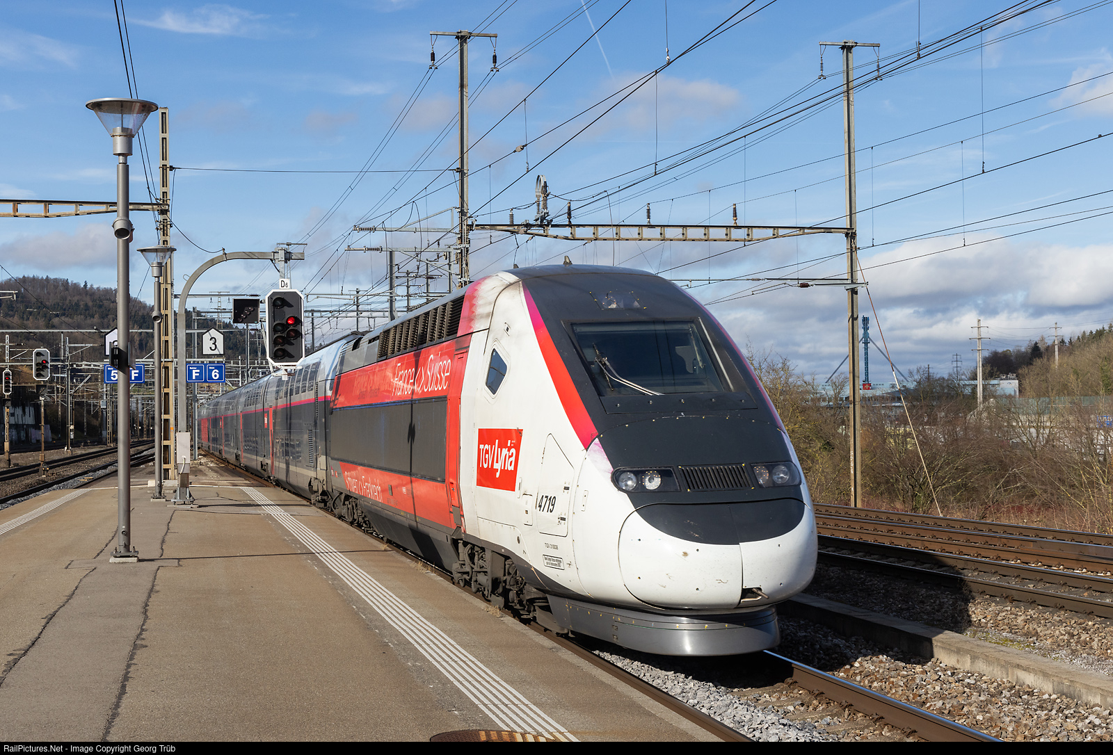 | TGV 2N2 (Euroduplex) # 4719 of the Lyria is running the about 1/2 hour late TGV 9203 from Paris Gare de Lyon via Belfort-Montbéliard TGV-Mulhouse-Basel to Zürich, through Killwangen-Spreitenbach. |