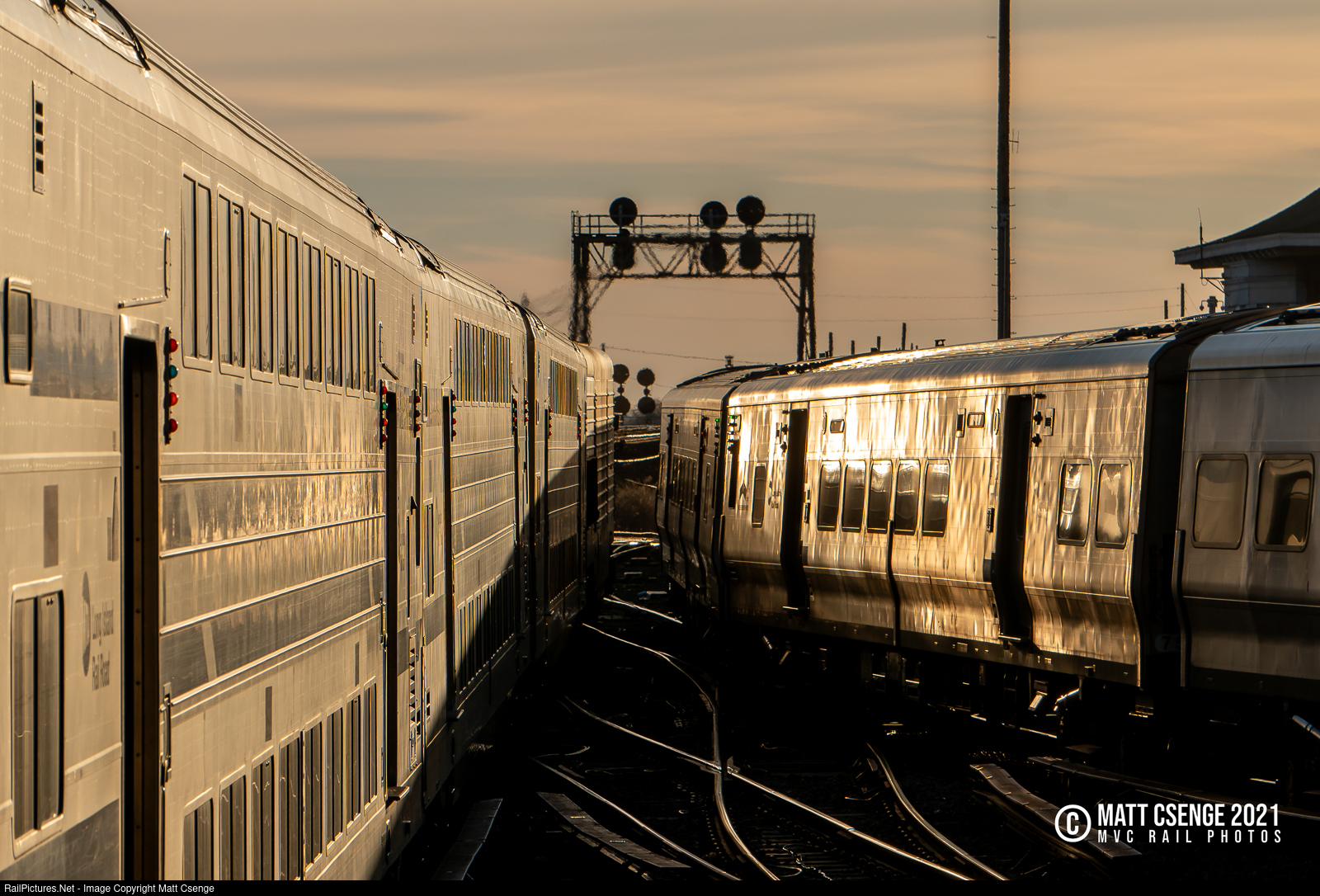 Two eastbound LIRR trains part ways at Jamaica Station as the setting sun reflects off the stainless steel cars. I particularly like how this lighting makes the door lights on the C3 car look like candy.
