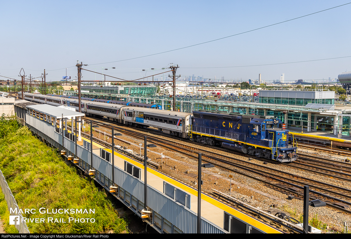 Special For The 4:11 PM To Raritan. On one of the few days that it visited the Raritan Valley Line this summer, NJT Train 5431 was led by CNJ tribute unit NJTR 4109 (née CNJ 3677, GP40-P, EMD, 10/1968). Once upon a time this was a common sight as this was one of 13 GP40-Ps purchased for service on this line and the North Jersey Coast Line, but by the 1980s, brand new EMD F40PHs had displaced the standard cabs. Fast forward yet another 40 years, and the geeps remain while those F40s are few in number. The train is seen passing through the PATH Station in Harrison, New Jersey on September 7, 2023, just before arriving at Newark Penn Station to begin its trip.