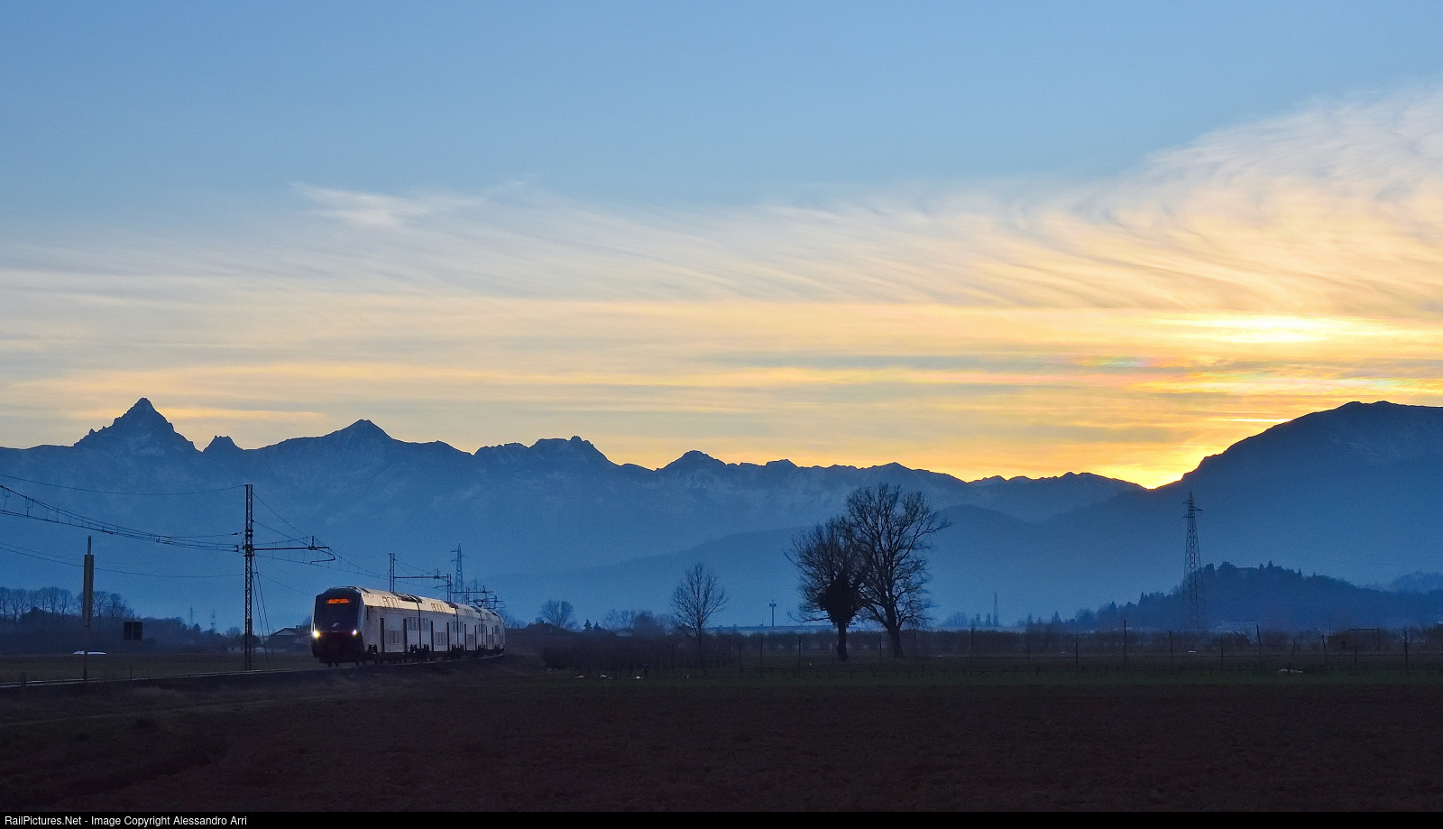 | Regional train of the SFM2 line from Pinerolo to Chivasso. Iridescent clouds appear above the Alps, a phenomenon related to the formation of ice crystals at high altitudes. |