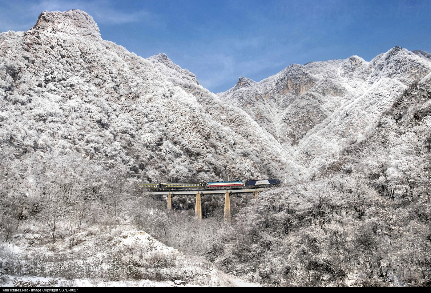 | In the Qinling Mountains on a clear winter day, passenger trains pass through rime-covered mountains. Trains spiral up the mountains, where only more locomotives can pull the train over the Qinling Mountains |