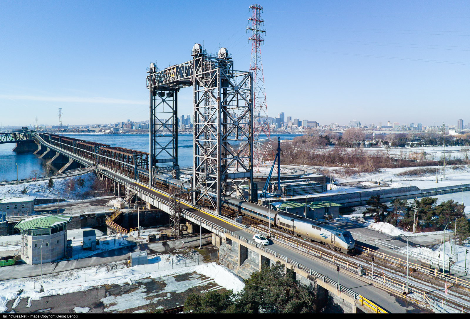 On its way from Montreal to New York, the Adirondack just crossed the Saint-Lawrence and will soon diverge from CN
