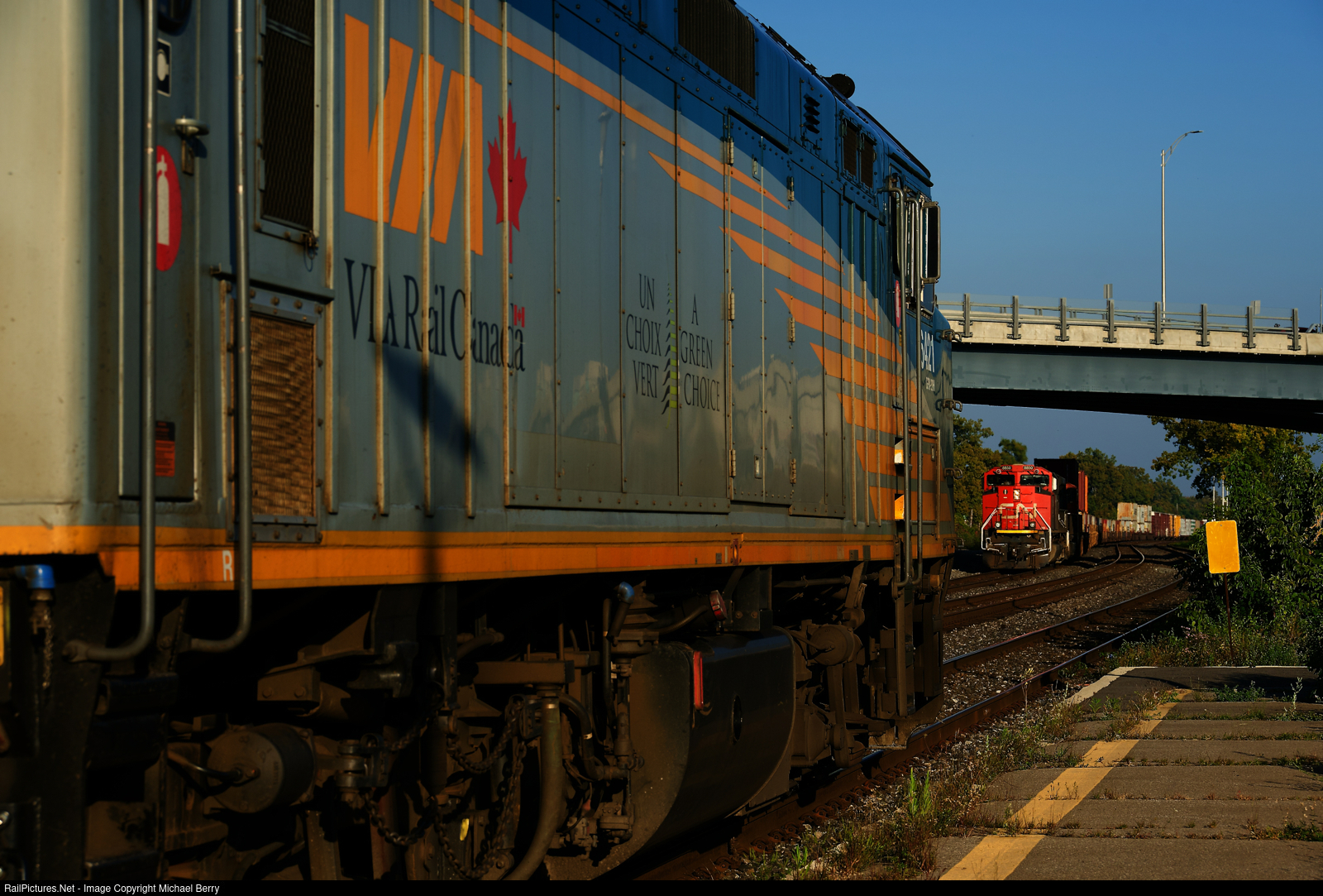 CN 327 is holding on Track DX-1 as VIA 64 leaves Dorval Station.
