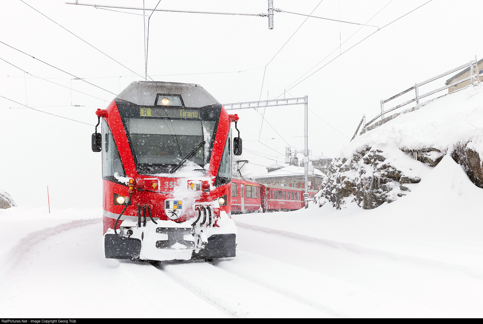 | Regional train 4621 of the line R19 from St.Moritz over the Bernina pass to Tirano reached Alp Grüm, with "Allegra" ABe 8/12 # 3513 pulling and 7 cars. The trains on the Bernina line in winter, especially on weekends, are often very overcrowded py passengers from Italy, in the morning in direction Engadine and in the afternoon back. |