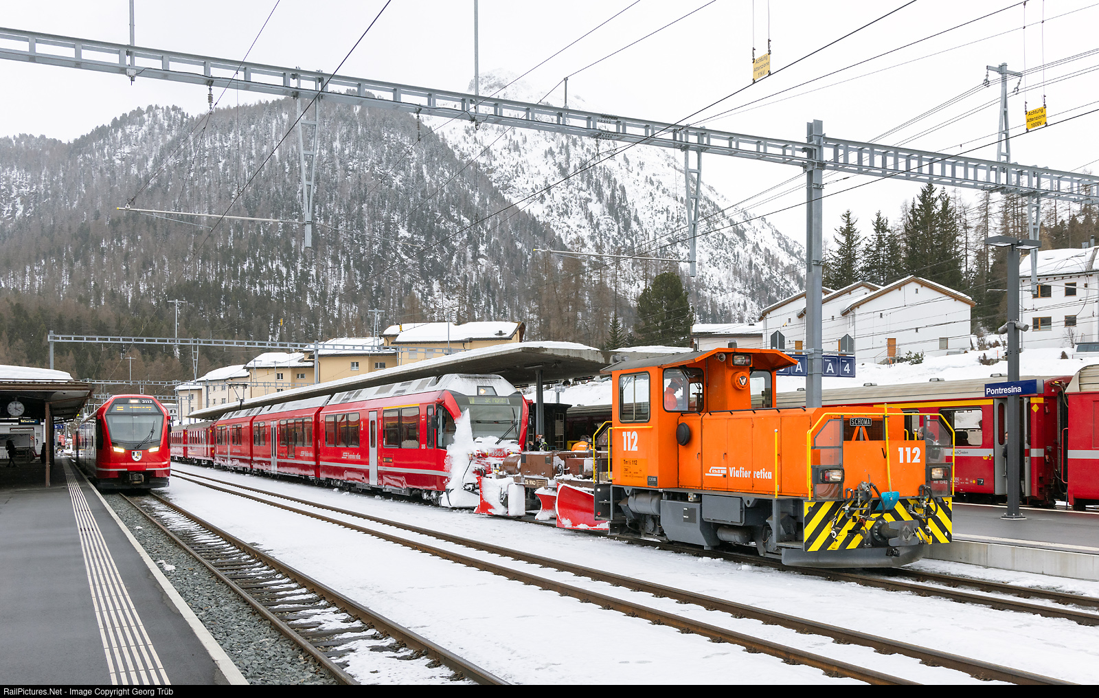 Pontresina station of the Rhaetian Railway. On the left on track 1 is the R15 service 1956 to Samedan-Zernez-Scuol-Tarasp with "Capricron" ABe 4/16 # 3112. In the middle on track 3, just arrived from Tirano, is "Allegra "ABe 8/12 # 3505 with R 4656 of the line R19, which shoved the track plough Xk # 9143. The orange shunter Tm 2/2 # 112 is ready to pull away this track plough, which is not needed anymore for the run to St.Moritz.