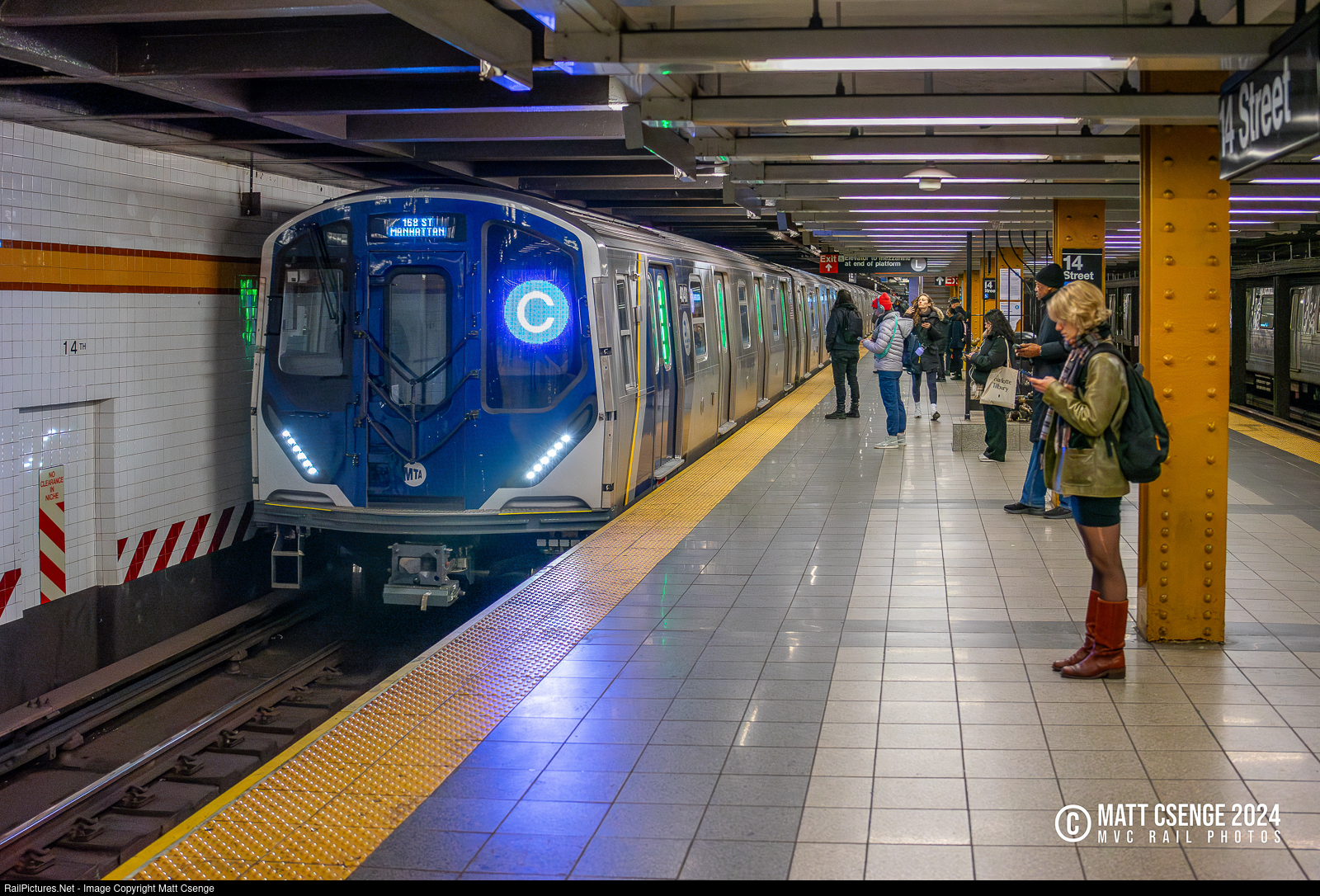 New York City Transit Authority (NYCTA) R211T no. 4040 is the lead motor on an uptown C train seen arriving at 14th St Station in the IND 8th Avenue Line. The T variant of the new rolling stock model features open gangways between cars, and two prototype trains are undergoing initial revenue testing on the C. |