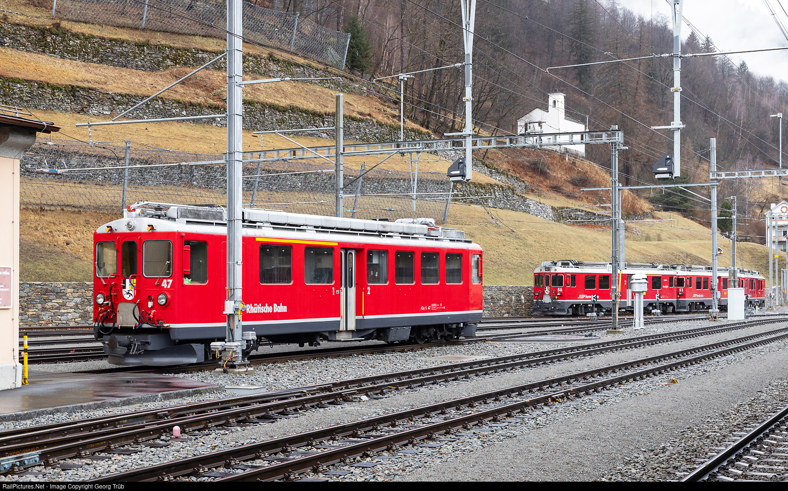 Stabled railcars of the Bernina line of the Rhaetian Railway in Poschiavo. ABe 4/4 # 47 is of the second generation, called "TW II" (railcar second generation) and used by the infrastructure department for de-icing of the overhead wire. The railcars ABe 4/4 # 56, # 51 and # 53 of the third generation (TW III) are out of service since december 2023, the future is unknown. # 55 of the series has been scrapped already.