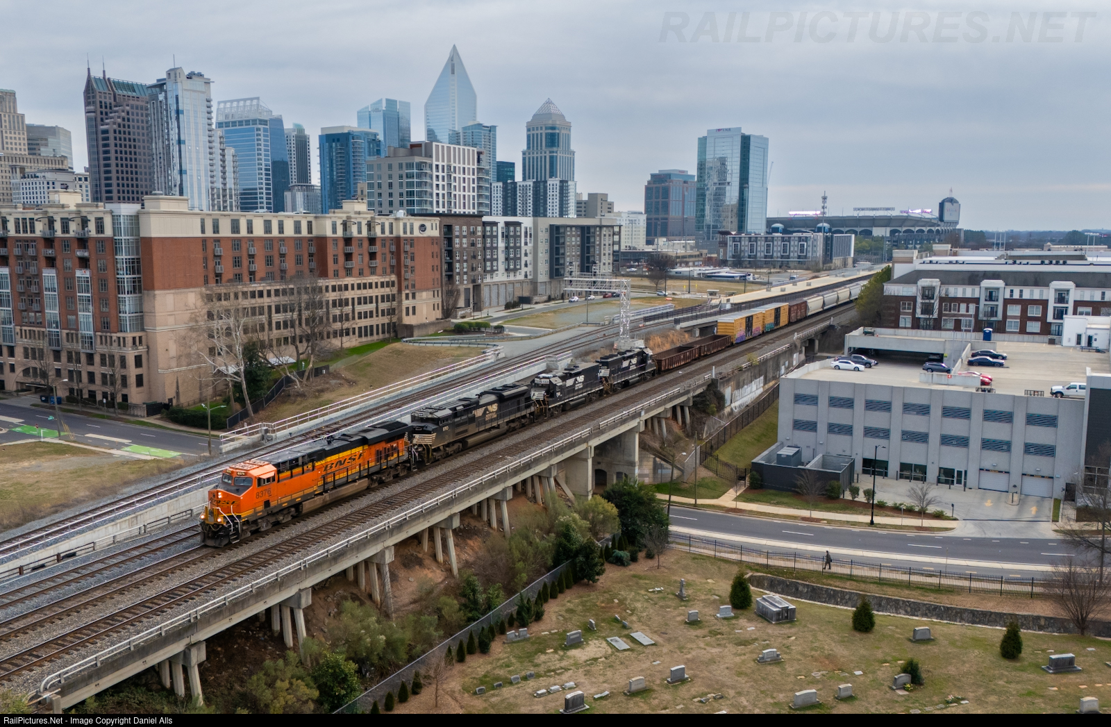A BNSF GE leads NS 154 through Charlotte, NC.