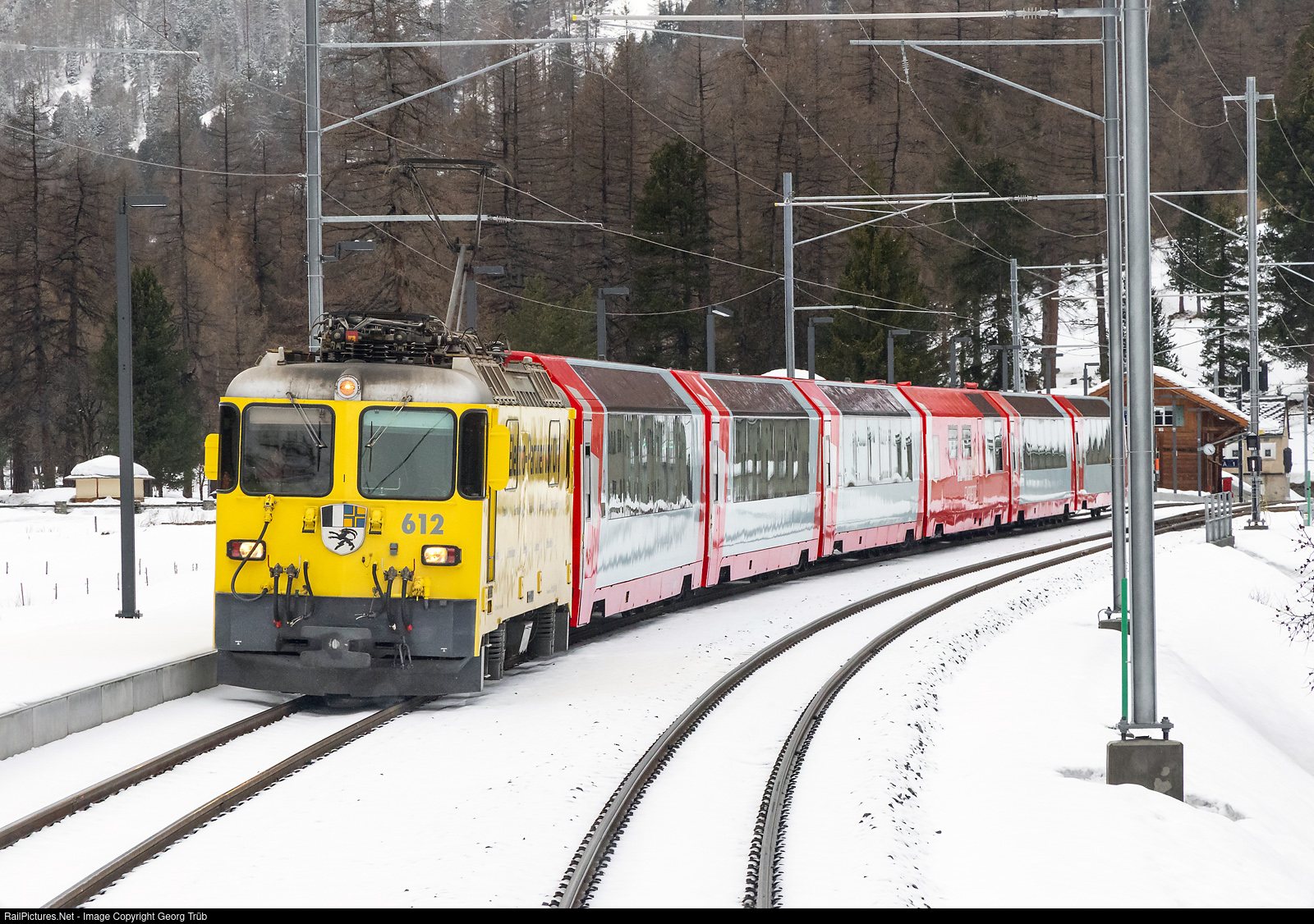 | Crossing of the Interregio St.Moritz-Chur in Spinas with the GLACIER EXPRESS PE 902 from Zermatt to St.Moritz, pulled by Ge 4/4 II # 612 in the yellow "Burkhalter" paint scheme, in charge between Chur and St.Moritz. |