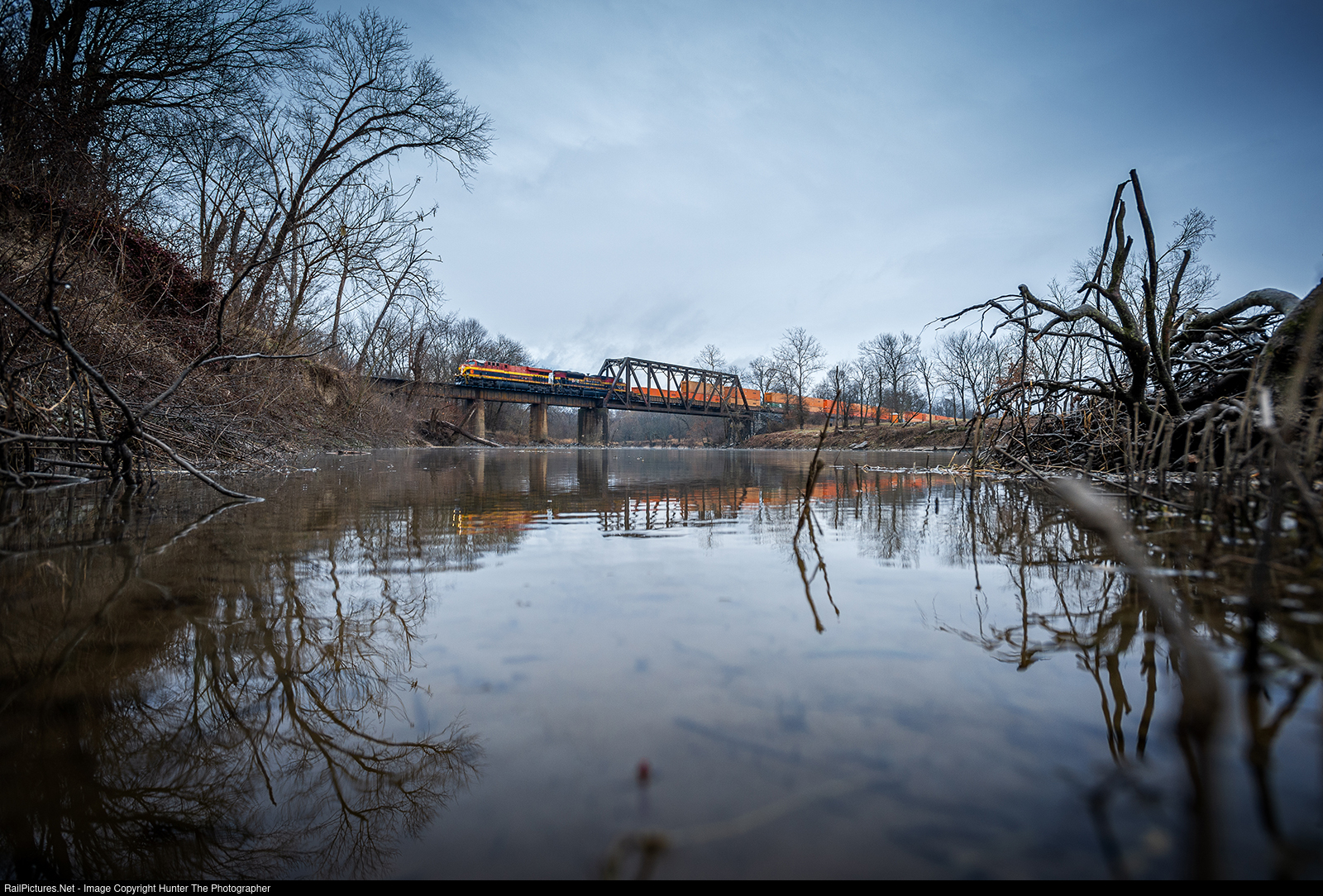 | After a snow shower on the morning of Monday, February 12, 2024, northbound CPKC intermodal train I181 crosses the Illinois River just north of Watts, OK.