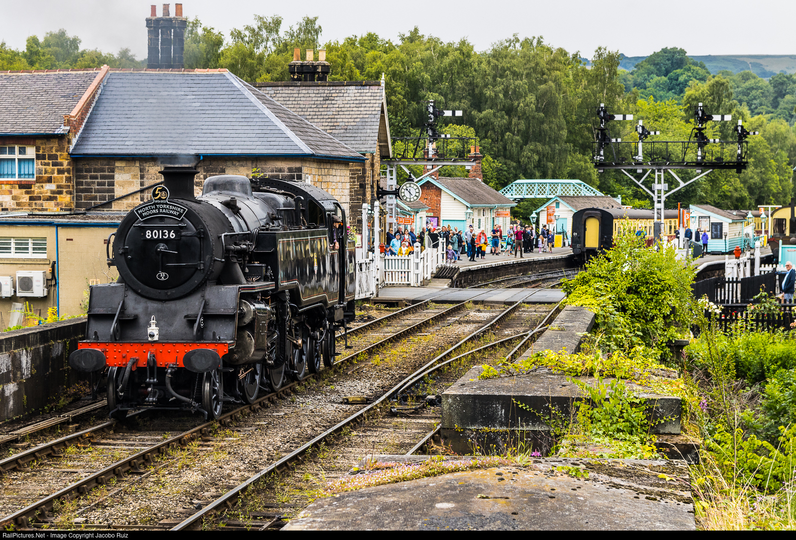 80136 Preserved British steam locomotive arriving at Grosmont station for the departure of a tourist train on a cloudy summer day