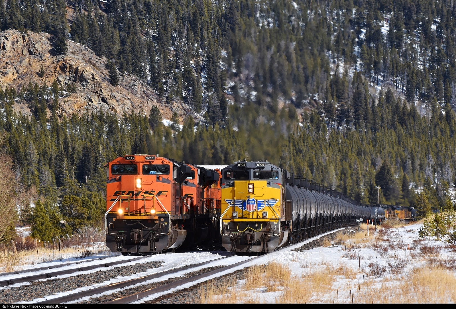 UP 8995 (SD70AH) muscles an oil can train past a BNSF freight train Tolland, Colorado.