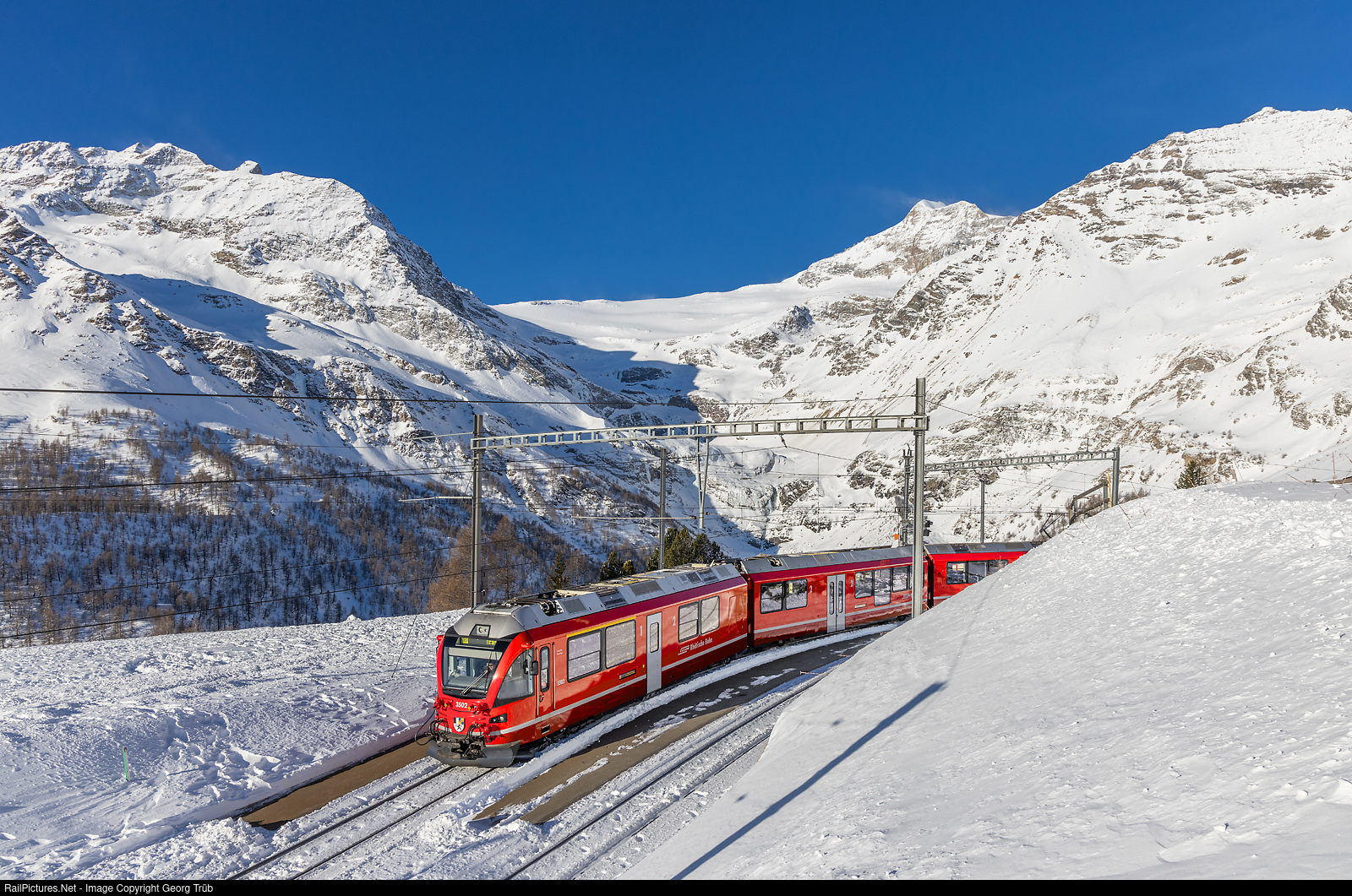 Railcar "Allegra" ABe 8/12 # 3502 of the Rhaetian Railway is leaving Alp Grüm with regional train 4613 of the line R19 from St.Moritz to Tirano. In the background from left to right Pizzo di Varuna, Piz Canton, Palü glacier, east peak of Piz Palü 3882 meter, Punta Carale, Sassal Mason.