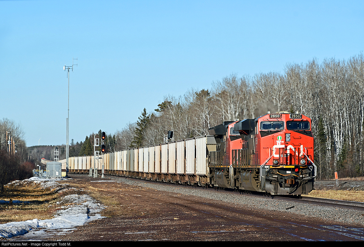 | A long empty all-rail taconite train slows for the upcoming stop before shoving into Keenan yard where the train will be split and staged until their load time at the U.S. Steel Minntac plant becomes available. The DPU, CN 2850, will reassemble the train and lead up to the plant to load before departing south with taconite pellets. |