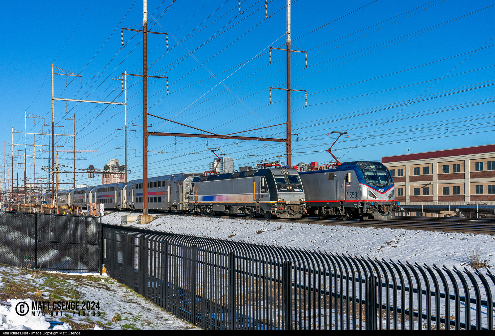 NJ Transit ALP-46A no. 4646 (Bombardier, 2009-2011) and Amtrak ACS-64 no. 659 (Siemens Cities Sprinter, 2012-2016) are seen racing down the Northeast Corridor through New Brunswick, operating Northeast Corridor Line train 3937 and Northeast Regional train 85, respectively. Interestingly 659 is operating with the front pantograph up, rather than the typical rear one. This was a perfect example of being in the right place at the right time, as the Amtrak train had just peeked out from behind the NJT at the previous catenary bridge!