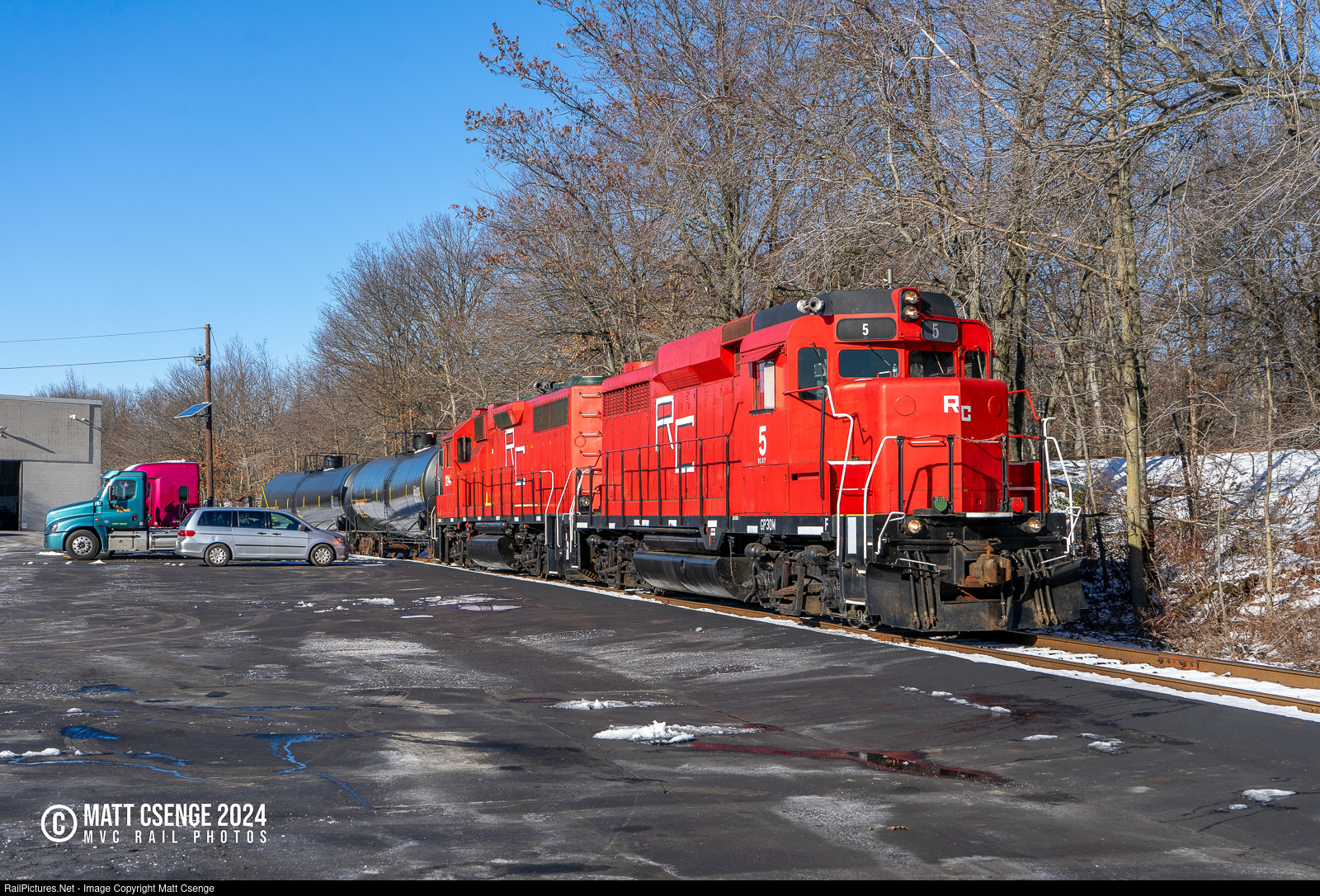 Raritan Central Railway GP30M no. 5 and GP38 no. 2244 are seen shuffling cars in the back lots of the Raritan Center business park where the railroad operates.