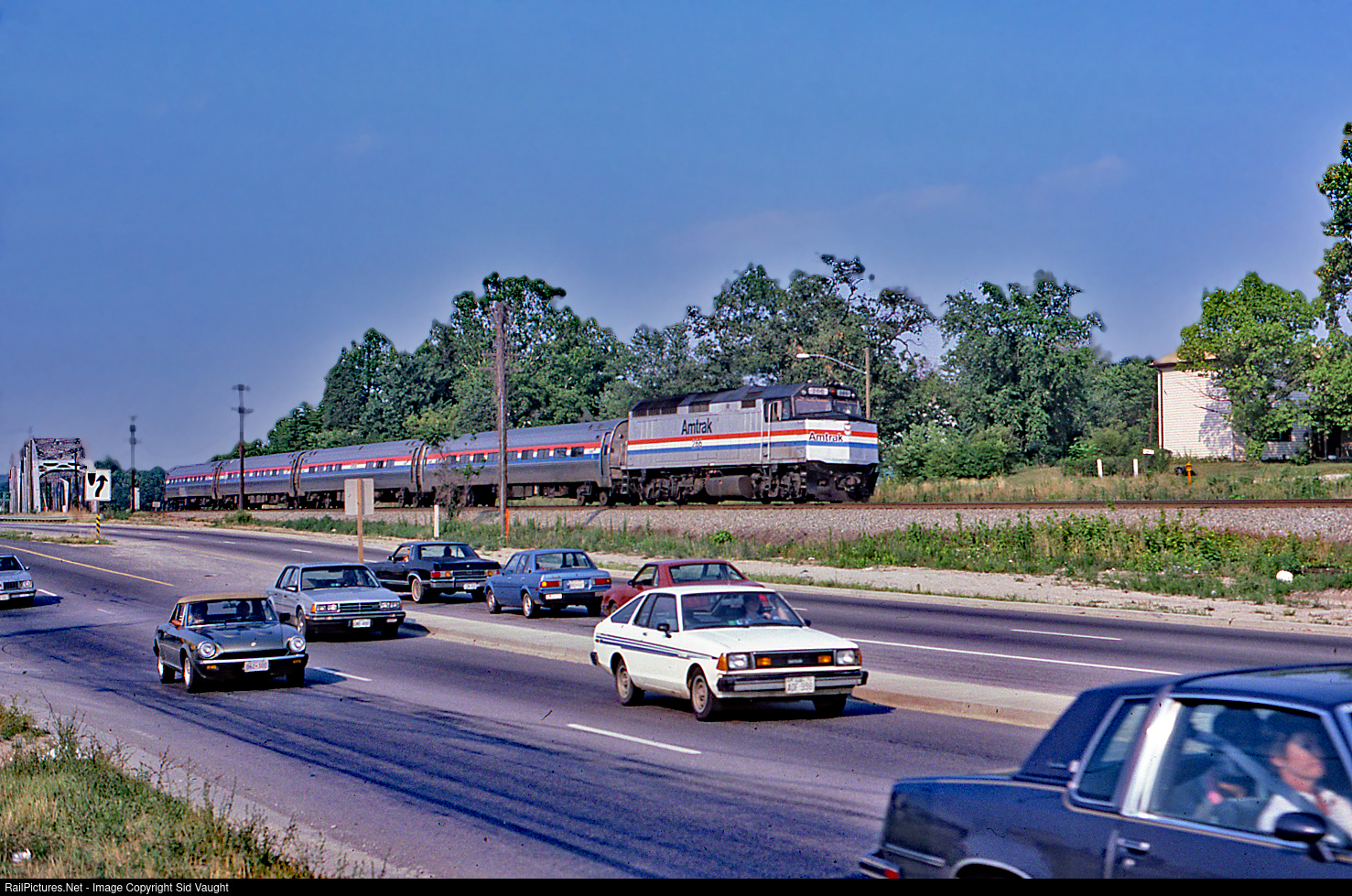 Racing south along with rush hour traffic a nicely matched set of Amfleet "airliners on wheels" is keeping up and perhaps gaining a little. Hey, I used to own one of those Nissan 510s!