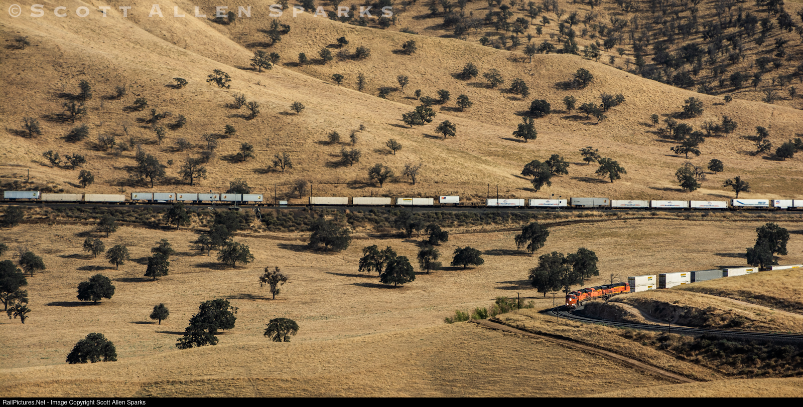 | A north bound BNSF intermodal is in the depths of a hot Tehachapi summer afternoon and the golden hillsides of the Allard horseshoe area as the trains exits the horseshoe curve and slowly works towards tunnel 2 and points beyond. |