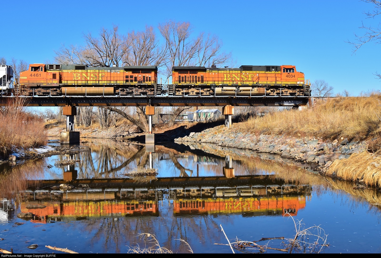 BNSF 4034 (Dash9) crosses the Cache La Poudre River in Fort Collins, Colorado.