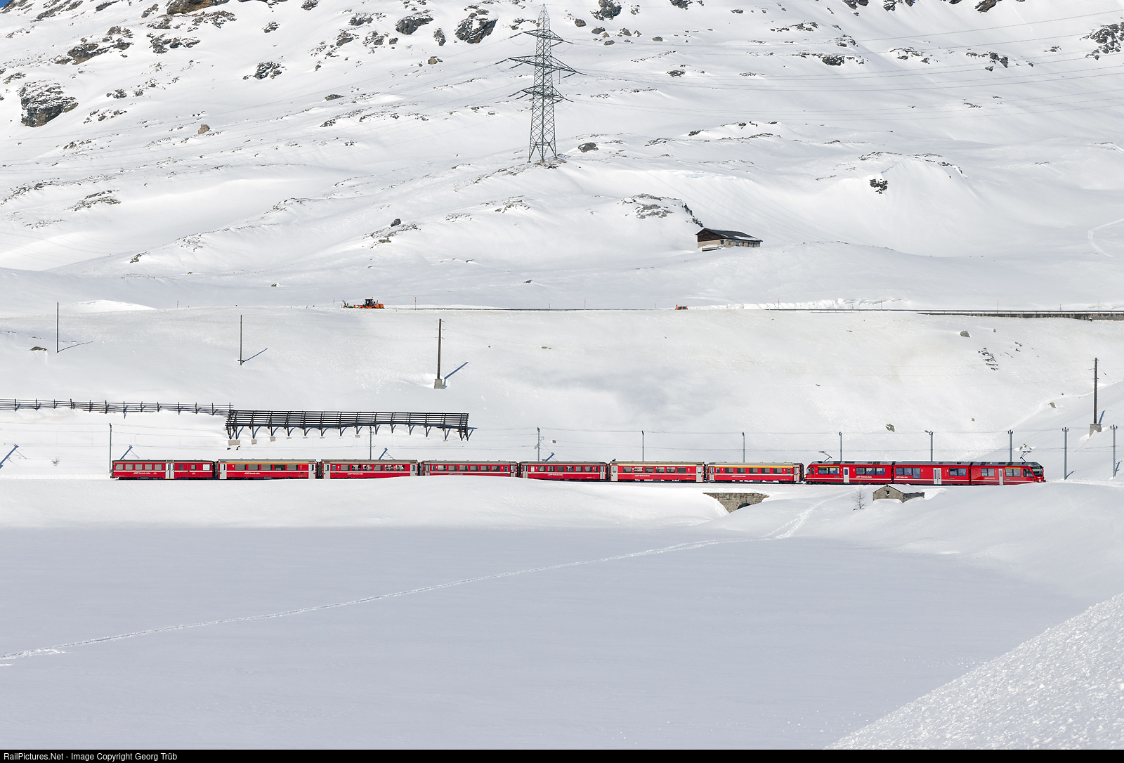 | "Allegra" ABe 8/12 # 3508 of the Rhaetian Railway is pulling the regional express train RE 1633 from St.Moritz to Tirano along the Lago Bianco on the Bernina pass, between Bernina Lagalb and Ospizio Bernina. The train is rounding the so called "Jochum curve" in the Val Bügliet. |