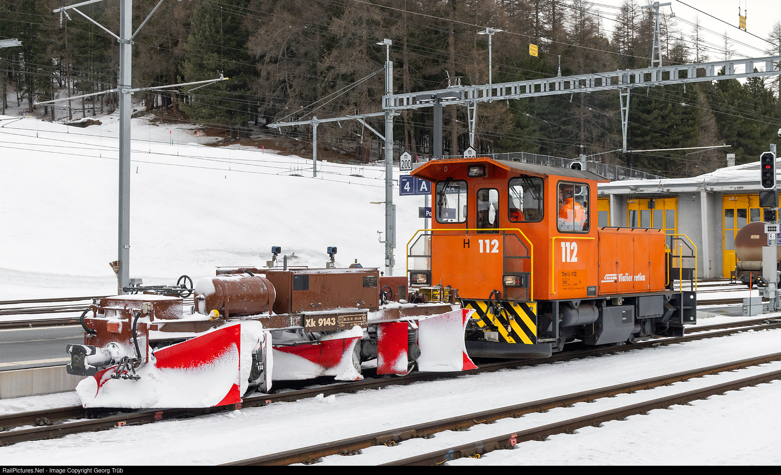 "Schöma" diesel shunter Tm 2/2 # 112 of the Rhaetian Railway in Pontresina, with track plough Xk # 9243, just pulled away from the front of the "Allegra" ABe 8/12 # 3505 with train 4656 from Tirano.